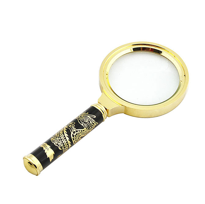 Лупа выполнена в оправе "под золото". На черной ручке выгравировано изображение дракона.