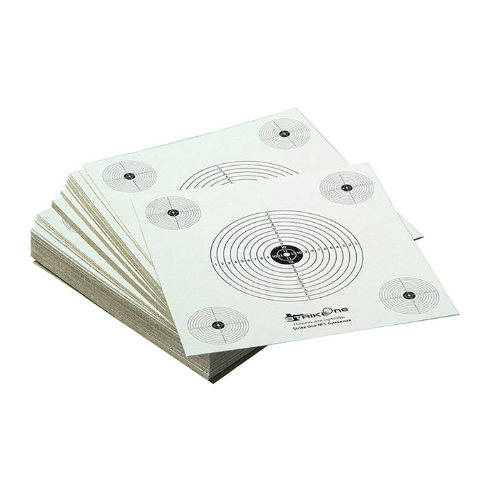 Мишень предназначена для охотничьих тренировок и развлекательной стрельбы в тирах. Основные параметры соответствуют стандартной мишени Strike One: материал изготовления — плотный картон размером 14×14 см. Фон белый, диаметр главной мишени 81 мм (на дополнительных 30мм), диаметр «десятки» и расстояние между окружностями 3 мм (на дополнительных 1 мм). Применяется на дистанциях до 10 м. Набор состоит из 100 мишеней. Особенностив наборе 100 мишеней