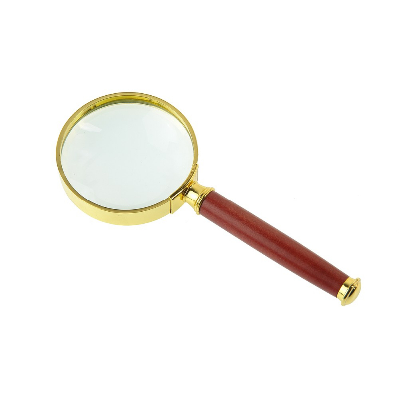 Оправа линзы изготовлена из металла с покрытием «под золото», а ручка из сандалового дерева. Длина ручки 73 мм.