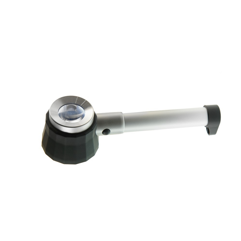На торцевой части ручки находится пластиковая накладка с выступом, который служит дополнительной опорой ручки. Благодаря ему, ручка лупы всегда параллельна плоскости наблюдаемого объекта, а оправа лупы плотно прилегает к его поверхности.