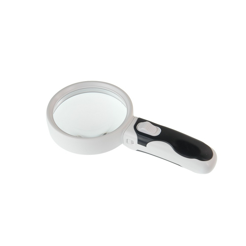 Оправа и ручка лупы изготовлены из пластика. Линза изготовлена из оптического стекла. Ручка съёмная со вставками из прорезиненного материала, длина ручки 101 мм. На передней стороне ручки расположен тумблер включения светодиодной подсветки, на обратной стороне — два светодиода. Питание подсветки осуществляется от 3 батареек ААА.