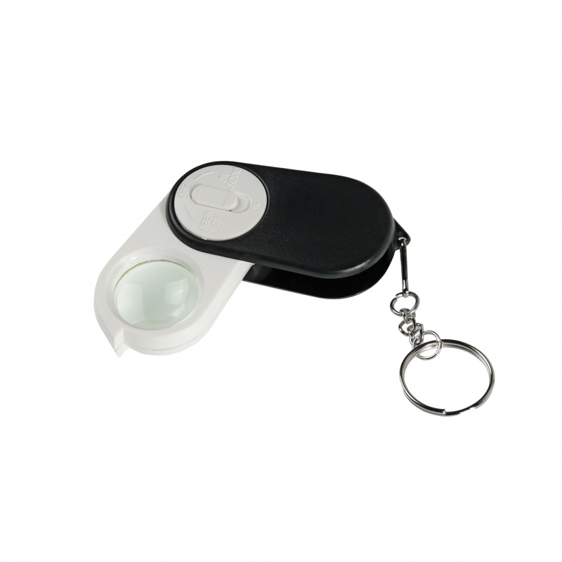 Складная лупа-брелок Veberс 10-кратнойлинзой (диаметр 23 мм) и со светодиодной подсветкой. Питание подсветки осуществляется от двух элементов CR2016 или одного элемента типа 2032 (идут в комплекте).