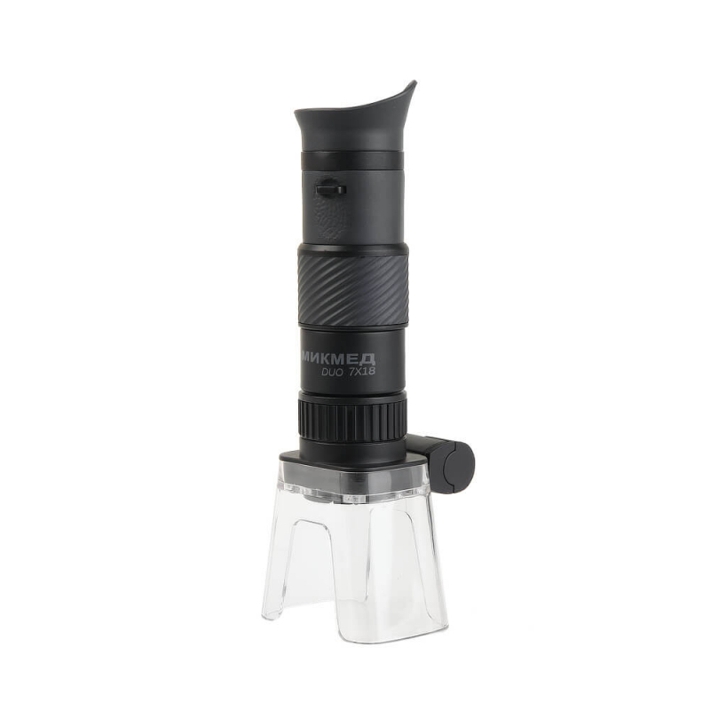 Мини-микроскоп МИКМЕД DUO 7х18– карманный микроскоп-монокуляр, состоящий из двух частей – портативного монокуляра с 7-ми кратным увеличением и микроскопной насадки-лупы, присоединение которой к объективу монокуляра дает примерно 25-ти кратное суммарное увеличение. Совместное использование монокуляра и микроскопной насадки делает сферы его применения безграничными: рассматривайте клеточную структуру растений, слои красок на картинах, надписи на микросхемах. Миниатюрные размеры микроскопа даже в собранном виде 12х6х6 см и вес около 100 г – позволят взять устройство с собой куда угодно: на рабочую встречу, «блошиный» рынок, прогулку.Микроскопная насадкаимеет собственное кольцо фокусировки, поэтому можете использовать ее отдельно от монокуляра, подстраивая резкость под свое зрение. 4х-кратное увеличение позволит использовать насадку при работе с ювелирными изделиями, ремонтируя часы, оценивая антиквариат. Насадка поможет обнаружить царапины на машине, прочитать мелкий текст и пригодится во многих других случаях. Насадку можно передвигать прямо по исследуемой поверхности – отполированный и закругленный торец не повредит предмет изучения. Размер пластиковой прозрачной юбки насадки 59х40х46 мм. Боковые вырезы в юбке сделаны для удобства работы с инструментом типа пинцета, длинной иглы и пр.Эргономичный корпус монокуляраизготавливается из ABS-пластика с рифленой резиновой накладкой на кольце фокусировки. Монокуляр с удаленным выходным зрачком разрабатывался для удобства пользователей в очках – резиновый наглазник заворачивается, чтобы вести наблюдение, не снимая очков. Портативный монокуляр можно использовать как компактную зрительную трубу повышенной четкости с семикратным увеличением, в т. ч. для скрытного наблюдения.Источник света:четыре LED-светодиода, встроенных в основание корпуса микроскопной насадки. Благодаря светодиодным источникам микроскопом легко воспользоваться даже в пасмурный день и в условиях нехватки света. Светодиодные источники включаются кнопкой и питаются от двух комплектных батареек типа «таблетка» LR44. Батарейки устанавливаются в последовательности «-/+,-/+».Мягкий двухсекционный чехол-мешок, входящий в комплект, оберегает микроскоп во время переноски и в условиях хранения. Увеличение