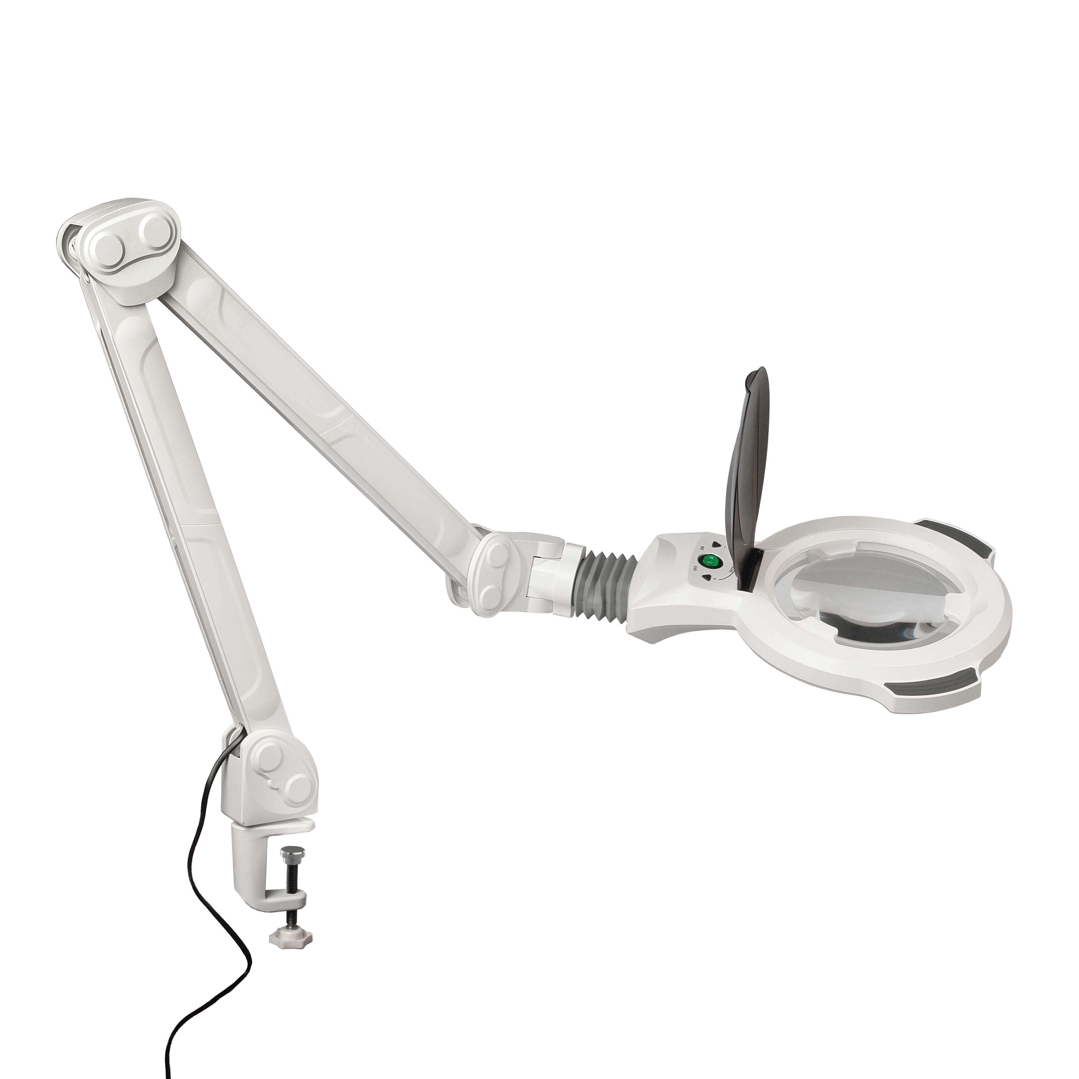 Подсветка имеет 4 режима работы разной мощности и освещенности: 2,5 Вт 900 лк / 3,5 Вт 1400 лк / 5,0 Вт 1900 лк / 7,0 Вт 2400 лк. Подсветка питается от бытовой сети переменного тока 100-240В через сетевой кабель. Лупа-лампабыстро и удобно крепится к столешнице или другой горизонтальной поверхности с помощью струбцины через металлический адаптер в нижней части лампы.