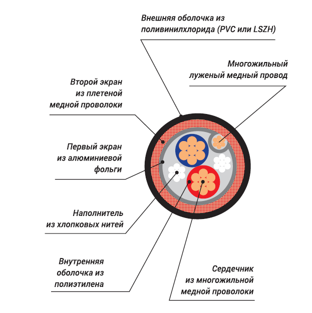 оплетка на основе луженой меди, покрытие 95%; полиэфирная алюминиевая фольга, покрытие 100%