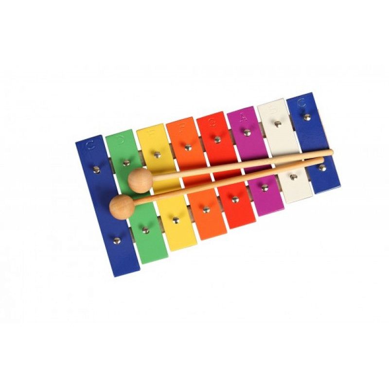 Данная модель имеет 8 разноцветных металлических пластинок, на каждой указана соответсвующая ей нота, в комплекте прилагается деревянная палочка для игры.