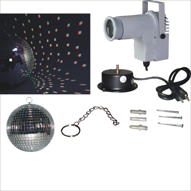 Готовый комплект для дискотеки. В комплект входит зеркальный шар диаметром 30см, мотор 3 оборота в минуту и подсветка LED-прожектор с Rainbow-эффектом мощностью 10Вт RGBW (4 в 1). Идеальное решение для оснащения небольших залов в ресторанах, кафе, школьных залов и домашнего использования.Шар предназначен для декоративного оформления интерьеров, при использовании световых пушек для создания классического светового эффекта метели из световых «зайчиков».