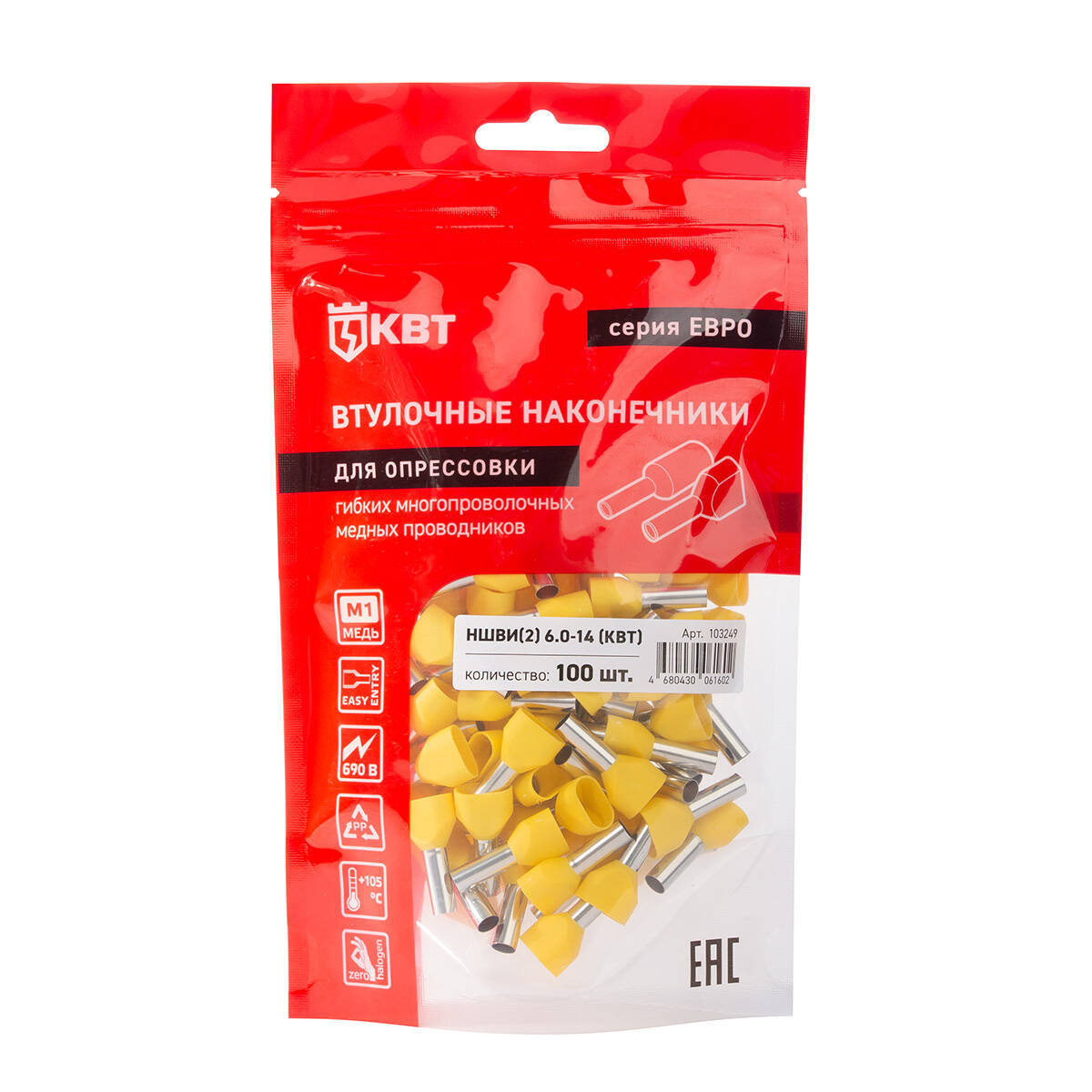 Оконцевание методом опрессовки гибких многопроволочных медных проводников сечением 2x6.0 мм². Трансформирует концы многожильных проводов в монолитные штифты. Монтаж сдвоенных проводов одинакового сечения