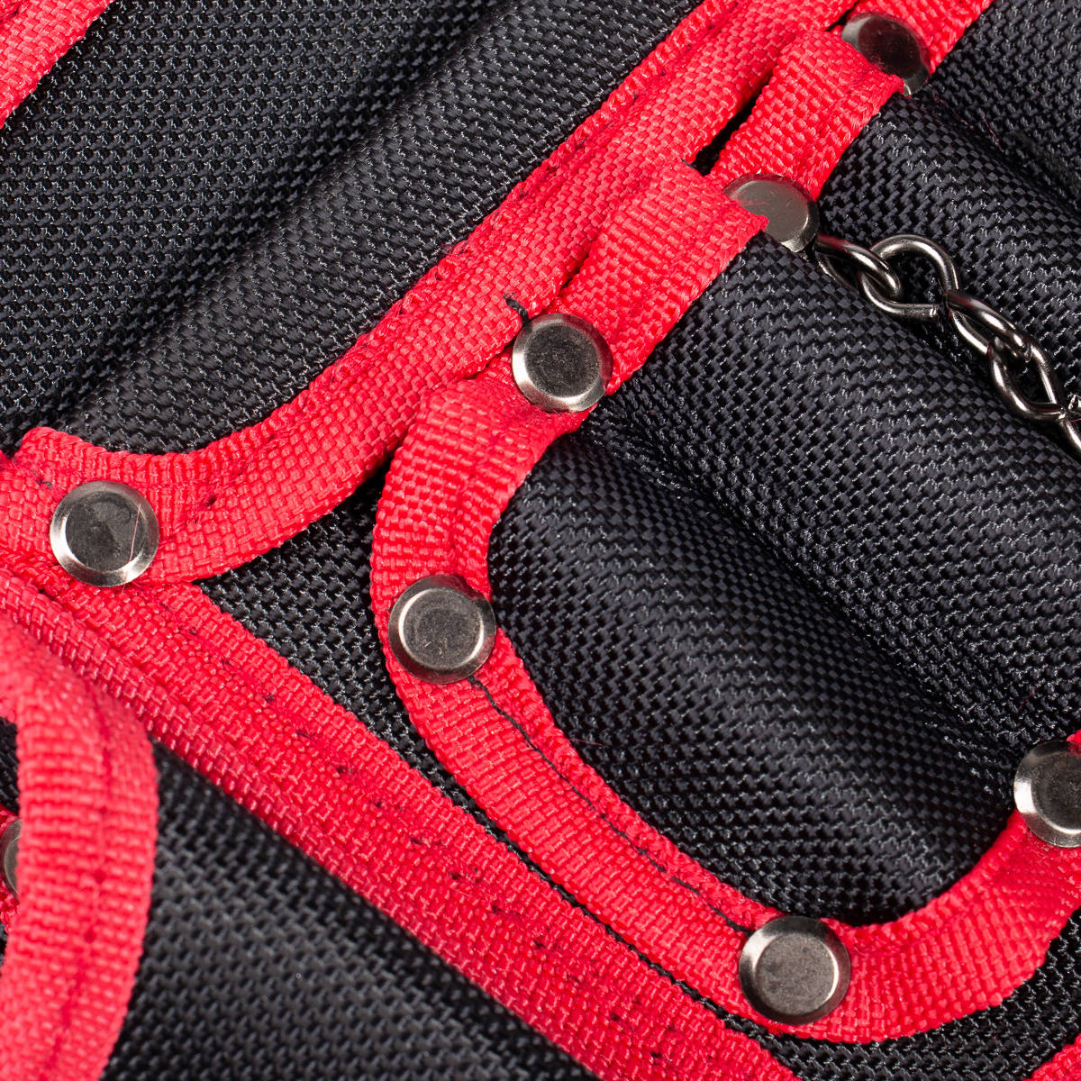 металлические заклепки, толстые стенки, металлические кольца для крепления помочей, металлический держатель
