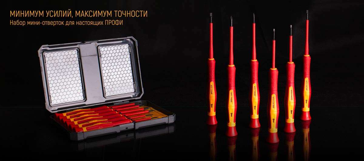 для работ под напряжением до 1000В, намагниченные наконечники, двухкомпонентная нескользящая рукоятка, отверстие для подвешивания, вращающаяся насадка на рукоятке