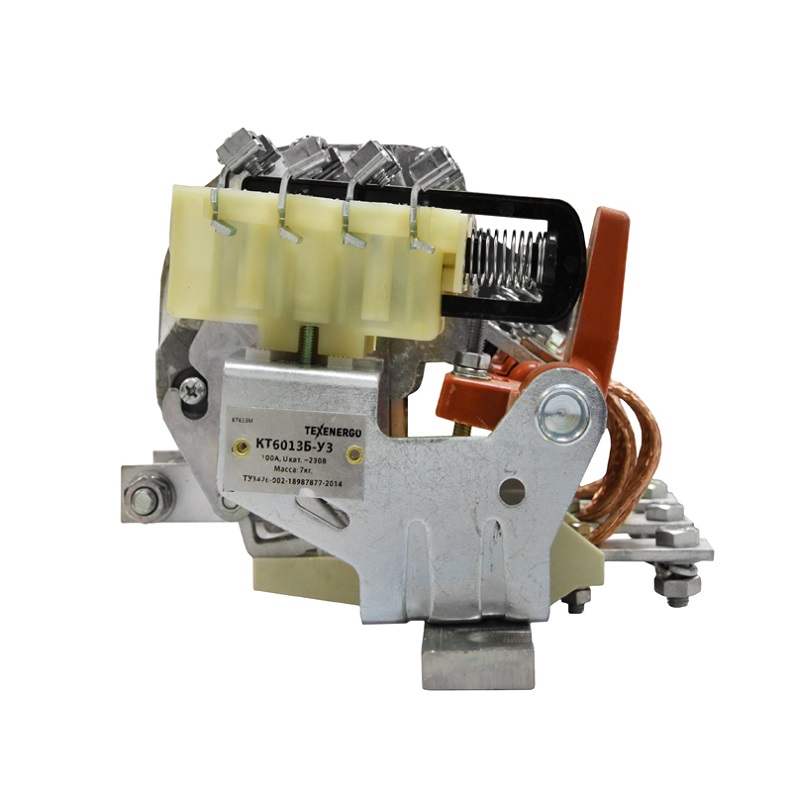 Контактор электромагнитного типа, открытый, общего применения с естественным воздушным охлаждением КТ 6013Б-У3 предназначен для включения и отключения приемников электрической энергии, при эксплуатации в условиях умеренного климата. Контактор изготовлен в строгом соответствии с требованиями ГОСТ, все детали и узлы отвечают самым высоким требованиям и прошли строгий контроль на заводе-изготовителе и четко соотвествуют предъявляемым нормам и стандартам при соблюдении протоколов повышения эффективности системы менеджмента качества. Что позволяет предложить вам надежный и качественный аппарат, подтверждающий свой достойный технический уровень уже одним внешним видом и вниманием к деталям. > Контакторы электромагнитные переменного тока КТ6013 рассчитаны для включения и отключения электрических цепей переменного тока напряжением до 380 В в стационарных приводах в дистанционном режиме, а именно: частый пуск короткозамкнутых электродвигателей, а также реверсирование электродвигателей, широко применяются в составе НКУ для включения мощных электрических машин, в аппаратуре АВР и других распределительных устройствах. Контакторы обеспечивают большое число включений и отключений (циклов) при дистанционном управлении ими. Механическая износостойкость КТ6013 составляет 10 млн. циклов, а коммутационная износостойкость равна 330 тысяч циклов. Допустимая частота включений в час 1200. Категория основного применения АС-4. Контактор трехфазный, имеет три силовых контакта для пропускания тока и коммутации приемников электрической энергии. Предназначен для работы под нагрузкой, т.е. при протекании токов по силовой цепи не превышающих номинальных значений, для контактора КТ6013 Iном=100 А. Возникающая электрическая дуга в месте разрыва силовых контактов эффективно гасится с помощью дугогасительных камер. Управление контактором осуществляется переменным током 220 В, 50 Гц. Блок-контакты собраны по схеме: 2з+2р. КТ 60 Х1 Х2 Б Х3 Х4 Х1 - величина номинального тока (1 - 100 А, 2 - 160 А, 3 - 250 А, 4 - 400 А, 5 - 630 А, 6 - 1000 А) Х2 - количество полюсов Б - контактор модернизированный Х3 - материал главных контактов (С - контакты металлокерамические на основе серебра, (-) - контакты медные) Х4 - напряжение катушки управления Уже в течение полувека контактор КТ6013 не претерпевает никаких изменений конструкции, простота которой являет собой наиболее наглядное доказательство высшей степени надежности контактора.