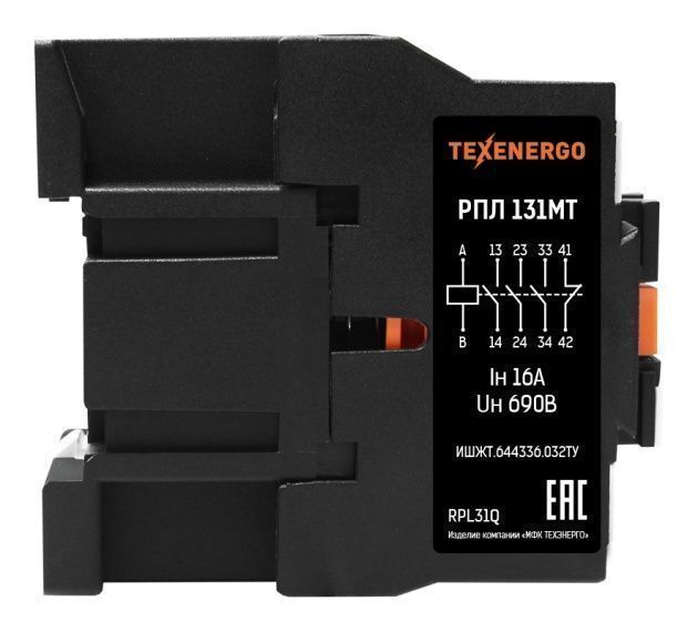 Промежуточные реле типа РПЛ-122, РПЛ-131, РПЛ-140 применяются в схемах управления электрооборудованием в стационарных промышленных установках переменного напряжения до 690 В частотой 50 и 60 Гц или в схемах управления до 440 В постоянного тока. При работе с микропроцессорной техникой катушка управления реле шунтируется ограничителем перенапряжения ОПН. Реле может быть доукомплектовано одной приставкой ПКЛ или ПВЛ. Схема управления данного реле 3НО+1НЗ: три нормально открытых контакта (3НО) и один нормально закрытый контакт (1НЗ). Контакты мгновенного действия. Номинальный ток контактов реле - 16 А. Исполнение по коммутационной износостойкости в режиме нормальных коммутаций - класс Б или 1.600.000 циклов замыкания исполнительных контактов реле при номинальных токах не более 16 А. Катушка управления реле: 42 В переменного тока частотой 50/60 Гц.