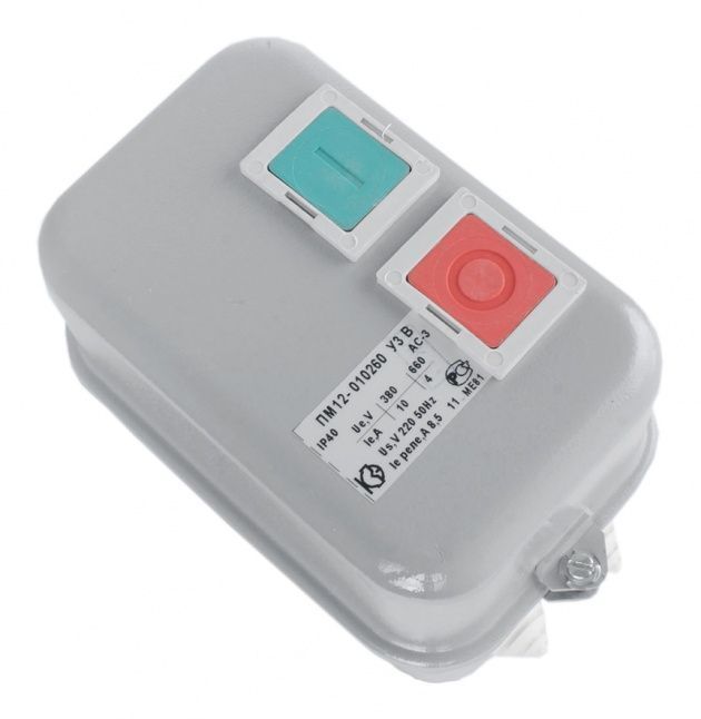 Пускатели электромагнитные серии ПМ12 предназначены для применения главным образом в стационарных установках для дистанционного пуска непосредственным подключением к сети, остановки и реверсирования трехфазных асинхронных электродвигателей с короткозамкнутым ротором при напряжении до 660 В переменного тока частоты 50 и 60 Гц. Для ограничения коммутационных перенапряжений, возникающих при отключении катушек управления, на пускатели серий ПМ12 могут устанавливаться ограничители перенапряжений ОПН. Пускатели, комплектуемые ограничителями перенапряжений, пригодны для работы в системах управления с применением микропроцессорной техники. Для защиты трехфазных асинхронных двигателей с короткозамкнутым ротором от перегрузок недопустимой продолжительности и от токов, возникающих при обрыве одной из фаз, предназначены трехполюсные электротепловые токовые реле серии РТТ. Структура условного обозначения электромагнитных пускателей ПМ12: ПМ12 - Х Х Х Х Х Х Х Х 1. Обозначение серии: 2. Цифры, указывающие условное обозначение номинального тока: 010 —10 А 025 —25 А 040 —40 А 063 —63 А 100 —100 А 160 —160 А 250 —250 А 3. Цифра, указывающая условное обозначение пускателей по назначению и наличию теплового реле: 1 - нереверсивный пускатель без теплового реле 2 - нереверсивный пускатель с тепловым реле 5 - реверсивный пускатель без теплового реле, с мех. блокировкой и степенью защиты IP00 6 - реверсивный пускатель с тепловым реле, с электрической и механической блокировками 4. Цифра, указывающая исполнение пускателей по степени защиты и наличию кнопок управления: 0 - степень защиты IP00 1 - степень защиты IP54 без кнопок 2 - степень защиты IP54 с кнопками «Пуск» + «Стоп» 3 - степень защиты IP54 с кнопками «Пуск» + «Стоп» + сигнальная лампа 4 - степень защиты IP40 без кнопок 5 - степень защиты IP20 6 - степень защиты IP40 с кнопками «Пуск» + «Стоп» 7 - степень защиты IP40 «Пуск» + «Стоп» + сигнальная лампа 5. Цифра, указывающая исполнение пускателей по числу и исполнению контактов вспомогательной цепи: 0 - исполнение 1з для пускателей на номинальный ток: 10 А, 25 А, 40 А (2з+2р для пускателей на номинальный ток 100 А,125 А,160 А,180 А, 250 А) 1 - исполнение 1р для пускателей на номинальный ток: 10 А, 25 А, 40 А (4з+4р для пускателей на номинальный ток: 100 А,125 А,160 А,180 А,2 50А) 6. Буква, характеризующая климатическое исполнение по ГОСТ 15150: (У) - стандартное исполнение (Т) - тропическое 7. Цифра, характеризующая категорию размещения ГОСТ 15150 8. Буква, указывающая исполнение по износостойкости: А, Б, В Пускатели 100-250 А изготавливаются, как с металлическим основанием, так и с пластмассовым.