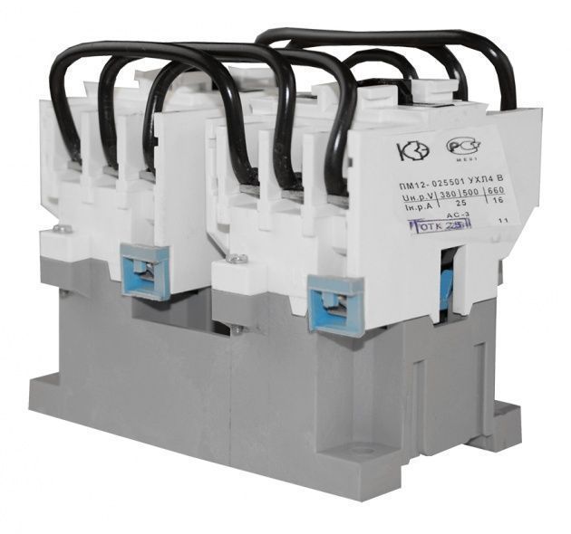 Пускатели электромагнитные серии ПМ12 предназначены для применения главным образом в стационарных установках для дистанционного пуска непосредственным подключением к сети, остановки и реверсирования трехфазных асинхронных электродвигателей с короткозамкнутым ротором при напряжении до 660 В переменного тока частоты 50 и 60 Гц. Для ограничения коммутационных перенапряжений, возникающих при отключении катушек управления, на пускатели серий ПМ12 могут устанавливаться ограничители перенапряжений ОПН. Пускатели, комплектуемые ограничителями перенапряжений, пригодны для работы в системах управления с применением микропроцессорной техники. Для защиты трехфазных асинхронных двигателей с короткозамкнутым ротором от перегрузок недопустимой продолжительности и от токов, возникающих при обрыве одной из фаз, предназначены трехполюсные электротепловые токовые реле серии РТТ. Структура условного обозначения электромагнитных пускателей ПМ12: ПМ12 - Х Х Х Х Х Х Х Х 1. Обозначение серии: 2. Цифры, указывающие условное обозначение номинального тока: 010 —10 А 025 —25 А 040 —40 А 063 —63 А 100 —100 А 160 —160 А 250 —250 А 3. Цифра, указывающая условное обозначение пускателей по назначению и наличию теплового реле: 1 - нереверсивный пускатель без теплового реле 2 - нереверсивный пускатель с тепловым реле 5 - реверсивный пускатель без теплового реле, с мех. блокировкой и степенью защиты IP00 6 - реверсивный пускатель с тепловым реле, с электрической и механической блокировками 4. Цифра, указывающая исполнение пускателей по степени защиты и наличию кнопок управления: 0 - степень защиты IP00 1 - степень защиты IP54 без кнопок 2 - степень защиты IP54 с кнопками «Пуск» + «Стоп» 3 - степень защиты IP54 с кнопками «Пуск» + «Стоп» + сигнальная лампа 4 - степень защиты IP40 без кнопок 5 - степень защиты IP20 6 - степень защиты IP40 с кнопками «Пуск» + «Стоп» 7 - степень защиты IP40 «Пуск» + «Стоп» + сигнальная лампа 5. Цифра, указывающая исполнение пускателей по числу и исполнению контактов вспомогательной цепи: 0 - исполнение 1з для пускателей на номинальный ток: 10 А, 25 А, 40 А (2з+2р для пускателей на номинальный ток 100 А,125 А,160 А,180 А, 250 А) 1 - исполнение 1р для пускателей на номинальный ток: 10 А, 25 А, 40 А (4з+4р для пускателей на номинальный ток: 100 А,125 А,160 А,180 А,2 50А) 6. Буква, характеризующая климатическое исполнение по ГОСТ 15150: (У) - стандартное исполнение (Т) - тропическое 7. Цифра, характеризующая категорию размещения ГОСТ 15150 8. Буква, указывающая исполнение по износостойкости: А, Б, В Пускатели 100-250 А изготавливаются, как с металлическим основанием, так и с пластмассовым.