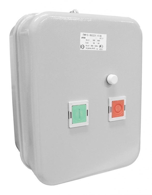 Пускатели электромагнитные серии ПМ12 предназначены для применения главным образом в стационарных установках для дистанционного пуска непосредственным подключением к сети, остановки и реверсирования трехфазных асинхронных электродвигателей с короткозамкнутым ротором при напряжении до 660 В переменного тока частоты 50 и 60 Гц. Для ограничения коммутационных перенапряжений, возникающих при отключении катушек управления, на пускатели серий ПМ12 могут устанавливаться ограничители перенапряжений ОПН. Пускатели, комплектуемые ограничителями перенапряжений, пригодны для работы в системах управления с применением микропроцессорной техники. Для защиты трехфазных асинхронных двигателей с короткозамкнутым ротором от перегрузок недопустимой продолжительности и от токов, возникающих при обрыве одной из фаз, предназначены трехполюсные электротепловые токовые реле серии РТТ. Структура условного обозначения электромагнитных пускателей ПМ12: ПМ12 - Х Х Х Х Х Х Х Х 1. Обозначение серии: 2. Цифры, указывающие условное обозначение номинального тока: 010 —10 А 025 —25 А 040 —40 А 063 —63 А 100 —100 А 160 —160 А 250 —250 А 3. Цифра, указывающая условное обозначение пускателей по назначению и наличию теплового реле: 1 - нереверсивный пускатель без теплового реле 2 - нереверсивный пускатель с тепловым реле 5 - реверсивный пускатель без теплового реле, с мех. блокировкой и степенью защиты IP00 6 - реверсивный пускатель с тепловым реле, с электрической и механической блокировками 4. Цифра, указывающая исполнение пускателей по степени защиты и наличию кнопок управления: 0 - степень защиты IP00 1 - степень защиты IP54 без кнопок 2 - степень защиты IP54 с кнопками «Пуск» + «Стоп» 3 - степень защиты IP54 с кнопками «Пуск» + «Стоп» + сигнальная лампа 4 - степень защиты IP40 без кнопок 5 - степень защиты IP20 6 - степень защиты IP40 с кнопками «Пуск» + «Стоп» 7 - степень защиты IP40 «Пуск» + «Стоп» + сигнальная лампа 5. Цифра, указывающая исполнение пускателей по числу и исполнению контактов вспомогательной цепи: 0 - исполнение 1з для пускателей на номинальный ток: 10 А, 25 А, 40 А (2з+2р для пускателей на номинальный ток 100 А,125 А,160 А,180 А, 250 А) 1 - исполнение 1р для пускателей на номинальный ток: 10 А, 25 А, 40 А (4з+4р для пускателей на номинальный ток: 100 А,125 А,160 А,180 А,2 50А) 6. Буква, характеризующая климатическое исполнение по ГОСТ 15150: (У) - стандартное исполнение (Т) - тропическое 7. Цифра, характеризующая категорию размещения ГОСТ 15150 8. Буква, указывающая исполнение по износостойкости: А, Б, В Пускатели 100-250 А изготавливаются, как с металлическим основанием, так и с пластмассовым.