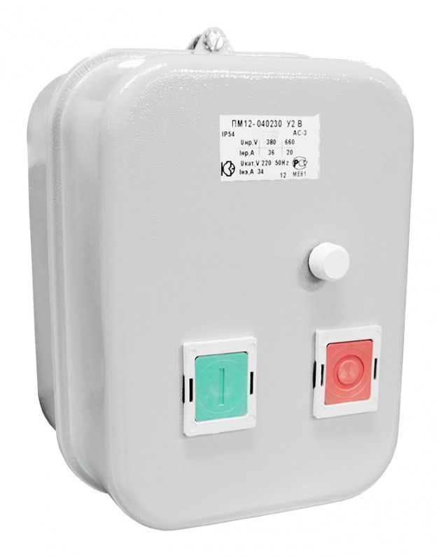 Пускатели электромагнитные серии ПМ12 предназначены для применения главным образом в стационарных установках для дистанционного пуска непосредственным подключением к сети, остановки и реверсирования трехфазных асинхронных электродвигателей с короткозамкнутым ротором при напряжении до 660 В переменного тока частоты 50 и 60 Гц. Для ограничения коммутационных перенапряжений, возникающих при отключении катушек управления, на пускатели серий ПМ12 могут устанавливаться ограничители перенапряжений ОПН. Пускатели, комплектуемые ограничителями перенапряжений, пригодны для работы в системах управления с применением микропроцессорной техники. Для защиты трехфазных асинхронных двигателей с короткозамкнутым ротором от перегрузок недопустимой продолжительности и от токов, возникающих при обрыве одной из фаз, предназначены трехполюсные электротепловые токовые реле серии РТТ. Структура условного обозначения электромагнитных пускателей ПМ12: ПМ12 - Х Х Х Х Х Х Х Х 1. Обозначение серии: 2. Цифры, указывающие условное обозначение номинального тока: 010 —10 А 025 —25 А 040 —40 А 063 —63 А 100 —100 А 160 —160 А 250 —250 А 3. Цифра, указывающая условное обозначение пускателей по назначению и наличию теплового реле: 1 - нереверсивный пускатель без теплового реле 2 - нереверсивный пускатель с тепловым реле 5 - реверсивный пускатель без теплового реле, с мех. блокировкой и степенью защиты IP00 6 - реверсивный пускатель с тепловым реле, с электрической и механической блокировками 4. Цифра, указывающая исполнение пускателей по степени защиты и наличию кнопок управления: 0 - степень защиты IP00 1 - степень защиты IP54 без кнопок 2 - степень защиты IP54 с кнопками «Пуск» + «Стоп» 3 - степень защиты IP54 с кнопками «Пуск» + «Стоп» + сигнальная лампа 4 - степень защиты IP40 без кнопок 5 - степень защиты IP20 6 - степень защиты IP40 с кнопками «Пуск» + «Стоп» 7 - степень защиты IP40 «Пуск» + «Стоп» + сигнальная лампа 5. Цифра, указывающая исполнение пускателей по числу и исполнению контактов вспомогательной цепи: 0 - исполнение 1з для пускателей на номинальный ток: 10 А, 25 А, 40 А (2з+2р для пускателей на номинальный ток 100 А,125 А,160 А,180 А, 250 А) 1 - исполнение 1р для пускателей на номинальный ток: 10 А, 25 А, 40 А (4з+4р для пускателей на номинальный ток: 100 А,125 А,160 А,180 А,2 50А) 6. Буква, характеризующая климатическое исполнение по ГОСТ 15150: (У) - стандартное исполнение (Т) - тропическое 7. Цифра, характеризующая категорию размещения ГОСТ 15150 8. Буква, указывающая исполнение по износостойкости: А, Б, В Пускатели 100-250 А изготавливаются, как с металлическим основанием, так и с пластмассовым.