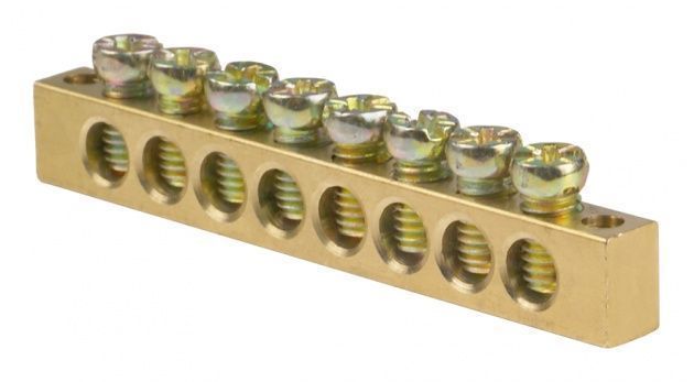 Применяются в щитовом оборудовании для подсоединения нулевых рабочих (N) и нулевых защитных проводов (PE). Крепление шины предусмотрено по центру (типы 8/1,14/1) и по краям (типы 8/2,14/2) через изолятор нулевой шины на 35 мм монтажную DIN-рейку и через угловые изоляторы нулевой шины, а так же непосредственно на панель щита. Материал шины: латунь