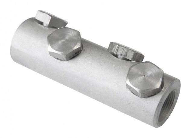 Предназначены для соединения любого типа проводников: круглых и секторных, моножильных и многожильных. Каждый соединитель является мультиразмерным и перекрывает диапазон сечений кабеля. Рекомендованы для монтажа термоусаживаемых муфт и оснащения ремонтно-аварийных служб Материал корпуса и болтов: специальный алюминиевый сплав. Крепление на жиле осуществляется методом завинчивания болтов со срывной головкой. Болтовые головки срываются при достижении установленного момента, обеспечивающего оптимальные механические и электрические свойства контактного соединения. Внутренняя рифленая поверхность соединителей увеличивает площадь контакта с токопроводящей жилой и позволяет выдерживать высокие нагрузки на разрыв. Конструкция болтов имеет несколько уровней проточек — срывных «шеек», благодаря чему срыв головки происходит вровень или ниже поверхности наконечника. Количество крепежных болтов и их расположение в двух наклонных плоскостях обеспечивает более надежную фиксацию кабельной жилы и увеличивает пятно электрического контакта. Соединители имеют стопорную перегородку, определяющую глубину захода кабельной жилы. На корпусе каждого соединителя выбита маркировка с указанием диапазона сечений кабеля. При срыве болтовых головок рекомендовано использование специальной зажимной струбцины и ключей. При монтаже соединителей первыми срываются головки болтов, расположенных ближе к центру. Технология оконцевания жил силовых кабелей с применением болтовых соединителей: 1. Снять изоляцию с конца жилы кабеля на длину, равную глубине захода жилы в соединитель плюс 5 мм. 2. Обезжирить растворителем поверхность оголенного участка жилы и внутреннюю поверхность соединителя. 3. Ввести зачищенный участок жилы в соединитель до упора и произвести предварительную затяжку болтов. 4. Зафиксировать наконечник специальным инструментом. В качестве инструмента для фиксации может быть использована струбцина. 5. Плавно (без рывков) произвести окончательную затяжку болтов до срыва головок. При монтаже болтовых соединителей первыми срываются головки болтов, которые находятся ближе к центральной разделительной перегородке. 6. В случае образования неровностей в местах срыва головок, их необходимо зачистить напильником.