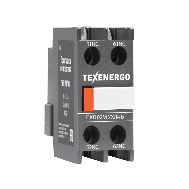 Приставки контактные ПКЛ, предназначены для увеличения количества вспомогательных контактов на электромагнитных пускателях типа ПМЛ, ПМ12 (2,3,4-величин), ПМ12-100 (аналог Tesys E), ПМ12-100М, 125М 1з+1р, ПМ12-160 (аналог Tesys E), ПМ12-250 (TeSys E), ПМ12 EURO, КМИ, КТИ, ПМ16, ПМУ, ПМУР, ПМЕ EURO, ПМА EURO. Приставки разработаны с целью расширения возможностей использования электромагнитных контакторов и пускателей в различных производственных сферах, когда появляется необходимость увеличения цепей вторичной коммутации в системах автоматизации и дистанционного управления. Приставки выпускаются с двумя или четырьмя мостиковыми контактами и различными схемами (комбинациями) замыкающих и размыкающих контактов. Приставки фиксируются на пускателях с помощью специальных защелок. Вспомогательные контакты используются в цепях управления и сигнализации. Приставки ПКЛ производства TEXENERGO являются наиболее востребованным изделием на рынке и отличаются оптимальным сочетанием цены и качества. Схема контактной группы: 2 размыкающих контакта. СТРУКТУРА УСЛОВНОГО ОБОЗНАЧЕНИЯ: ПКЛ ХХМ О4 Х ТЭ - первая цифра в обозначении (количество замыкающих контактов) - вторая цифра в обозначении (количество размыкающих контактов) - буква М - IP20 (отсутствие буквы - IP00) - климатическое исполнение (О) и категория размещения (4) - исполнение по коммутационной износостойкости (А, Б) Номинальное напряжение по изоляции - 660 В. Номинальный ток контактов: 10 А. Допускается применение приставок цепях управления с номинальным напряжением до 380 В переменного тока частоты 50, 60 Гц и 220 В постоянного тока. Степень защиты IP20 по ГОСТ 14254-96. Приставки предназначены для использования в следующих условиях: • температура окружающей среды от -40 до +55°С, • высота над уровнем моря не более 2000 м, • условия эксплуатации М7 по ГОСТ 17516.1-90. Габаритные размеры, мм- 24,1х48,3х38 Масса, кг, не более - 0,055 ГАБАРИТНЫЕ И УСТАНОВОЧНЫЕ РАЗМЕРЫ СХЕМЫ ЭЛЕКТРИЧЕСКИЕ Сведения о суммарной массе драгоценных материалов в приставкахСеребро ПКЛ-11А,ПКЛ-11МА,ПКЛ-20А,ПКЛ-20МА0,4242 г ПКЛ-11Б,ПКЛ-11МБ,ПКЛ-20Б,ПКЛ-20МБ0,3318 г ПКЛ-04А,ПКЛ-04МА,ПКЛ-22А,ПКЛ-22МА,ПКЛ-40А,ПКЛ-40МА0,8484 г ПКЛ-04Б,ПКЛ-04МБ,ПКЛ-22Б,ПКЛ-22МБ,ПКЛ-40Б,ПКЛ-40МБ0,6635 г Сведения о суммарной массе цветных маталлов в приставкахМедь и сплавы на медной основе ПКЛ-11,ПКЛ-11М4,132 г ПКЛ-20,ПКЛ-20М3,932 г ПКЛ-04,ПКЛ-04М8,664 г ПКЛ-22,ПКЛ-22М8,2642 г ПКЛ-40,ПКЛ-40М7,864 г