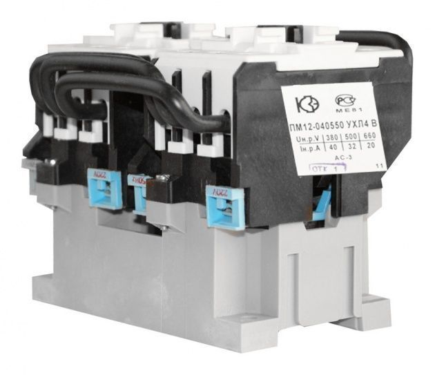 Пускатели электромагнитные серии ПМ12 предназначены для применения главным образом в стационарных установках для дистанционного пуска непосредственным подключением к сети, остановки и реверсирования трехфазных асинхронных электродвигателей с короткозамкнутым ротором при напряжении до 660 В переменного тока частоты 50 и 60 Гц. Для ограничения коммутационных перенапряжений, возникающих при отключении катушек управления, на пускатели серий ПМ12 могут устанавливаться ограничители перенапряжений ОПН. Пускатели, комплектуемые ограничителями перенапряжений, пригодны для работы в системах управления с применением микропроцессорной техники. Для защиты трехфазных асинхронных двигателей с короткозамкнутым ротором от перегрузок недопустимой продолжительности и от токов, возникающих при обрыве одной из фаз, предназначены трехполюсные электротепловые токовые реле серии РТТ. Структура условного обозначения электромагнитных пускателей ПМ12: ПМ12 - Х Х Х Х Х Х Х Х 1. Обозначение серии: 2. Цифры, указывающие условное обозначение номинального тока: 010 —10 А 025 —25 А 040 —40 А 063 —63 А 100 —100 А 160 —160 А 250 —250 А 3. Цифра, указывающая условное обозначение пускателей по назначению и наличию теплового реле: 1 - нереверсивный пускатель без теплового реле 2 - нереверсивный пускатель с тепловым реле 5 - реверсивный пускатель без теплового реле, с мех. блокировкой и степенью защиты IP00 6 - реверсивный пускатель с тепловым реле, с электрической и механической блокировками 4. Цифра, указывающая исполнение пускателей по степени защиты и наличию кнопок управления: 0 - степень защиты IP00 1 - степень защиты IP54 без кнопок 2 - степень защиты IP54 с кнопками «Пуск» + «Стоп» 3 - степень защиты IP54 с кнопками «Пуск» + «Стоп» + сигнальная лампа 4 - степень защиты IP40 без кнопок 5 - степень защиты IP20 6 - степень защиты IP40 с кнопками «Пуск» + «Стоп» 7 - степень защиты IP40 «Пуск» + «Стоп» + сигнальная лампа 5. Цифра, указывающая исполнение пускателей по числу и исполнению контактов вспомогательной цепи: 0 - исполнение 1з для пускателей на номинальный ток: 10 А, 25 А, 40 А (2з+2р для пускателей на номинальный ток 100 А,125 А,160 А,180 А, 250 А) 1 - исполнение 1р для пускателей на номинальный ток: 10 А, 25 А, 40 А (4з+4р для пускателей на номинальный ток: 100 А,125 А,160 А,180 А,2 50А) 6. Буква, характеризующая климатическое исполнение по ГОСТ 15150: (У) - стандартное исполнение (Т) - тропическое 7. Цифра, характеризующая категорию размещения ГОСТ 15150 8. Буква, указывающая исполнение по износостойкости: А, Б, В Пускатели 100-250 А изготавливаются, как с металлическим основанием, так и с пластмассовым.