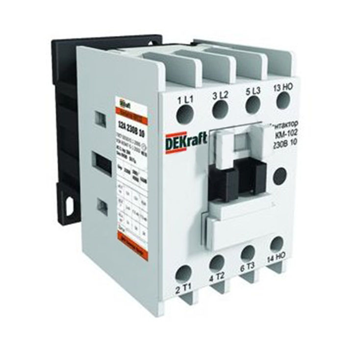 Контактор серии КМ-102 DEKraft, 3P, номинальный ток - 25 А (AC3, AC4), напряжение управления 380 В пер.тока, доп.контакты - 1НО, установка - на стандартную DIN-рейку. Контакторы КМ-102 предназначены для пуска и останова асинхронных двигателей, для коммутации осветительных сетей и конденсаторных батарей в сетях напряжением до 690 В пер.тока.