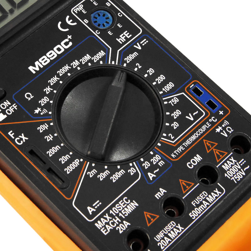 Мультиметры M890C+ представляют собой приборы общего назначения, сочетающие в себе большой набор функций, высокую точность, простоту в использовании, безопасность и надежность. M890C+ предназначен для выполнения базовых измерений, диагностики и поиска неисправностей. Он позволяет измерять постоянный и переменный ток , напряжение постоянного и переменного тока, сопротивление, имеет функцию прозвонки электрических цепей, проверки целостности диодов, измерение параметров транзисторов, измерения температуры в Цельсиях, измерение электрической ёмкости. Защиту от перегрузок обеспечивает встроенный плавкий предохранитель. Компактный и эргономичный дизайн. M890C+ обладает востребованным перечнем функций и параметров. Несмотря на то, что мультиметр M890C+ является прибором все же экономического класса, его можно смело отнести к профессиональным приборам за счёт своих функциональных возможностей и уровня его характеристик. Метод обработки информации основан на работе АЦП двойного интегрирования. ПАРАМЕТРЫ М890С+: Кнопка включения питания ON-OFF Поворотный переключатель на 32 положения для выбора функции ипредела измерения Высокая чувствительность (100мкВ) Автоматическая индикация полярности Автоматическая индикация перегрузки символом "1" Защита на всех диапазонах измерения Диодный тест на фиксированном токе 1 мА Измерение емкости конденсаторов от 1 пФ до 20 мкФ Измерение величины сопротивлений от 0,1 Ом до 200 МОм Транзисторный тест при фиксированном токе базы 100 мкА Измерение температуры Измерение частоты переменного тока РАБОЧИЕ ХАРАКТЕРИСТИКИ: Постоянное напряжение: 200мВ/2В/20В/200В ±0.5%, 1000В ±0.8% Переменное напряжение: 2В/20В/200В±0.8%, 750В±1.2% Постоянный ток: 2мА/20мА ±0.8%, 200мА ±1.2%, 20А ±1.2% Переменный ток: 200мА/20А Сопротивление: 200 Ω ±0,8%, 2 КΩ/20 КΩ/200 КΩ/2 МΩ: ±0,8%, 20 МΩ ±1.0%, 200 МΩ ±5.0% Емкость конденсаторов: 2000 пФ/20нФ/200нФ/2мкФ/20мкФ ±2.5% до ±5.0% Измерение температуры -20⁰С ~ 1000⁰С Прозвонка соединений - сигнал подается при сопротивлении 60 Ом Диодный тест - да Измерение hFE транзисторов – да ФУНКЦИОНАЛЬНЫЕ ХАРКТЕРИСТИКИ: Максимальное напряжение между гнездами и землей: Категория CAT II 1000 В, Категория CAT III 600 В Плавкий предохранитель: 200mA/250V (токовый вход А без предохранителя) Источник питания: Батарея 9В типа "Крона" Дисплей ЖК 1999 обновление 2-3 раза/сек. Метод измерения: АЦП с двойным интегрированием Индикация перегрузки Символ “1” Индикация полярности “-” при отрицательной полярности Диапазон рабочих температур: 0°С ... 40°С Диапазон температур хранения: -10°С ... 50°С Индикация разряда батарей В комплекте: измерительные щупы, термопара, силиконовый чехол, батарея Для более удобной работы мультиметра в задней части корпуса прибора предусмотрена встроенная откидная подставка, корпус прибора размещен в мягкой оранжевой силиконовой оболочке, имеющей два гнезда для размещения измерительных щупов в нерабочем положении прибора Параметр M890C+ M890D M890F M890G Постоянное/переменное напряжение * * * * Постоянный/переменный ток * * * * Сопротивление * * * * Проверка диодов * * * * hFE транзистора * * * * Емкость * * * * Температура * * Частота * * Прозвонка * * * * Скачать более подробное описание в формате .PDF