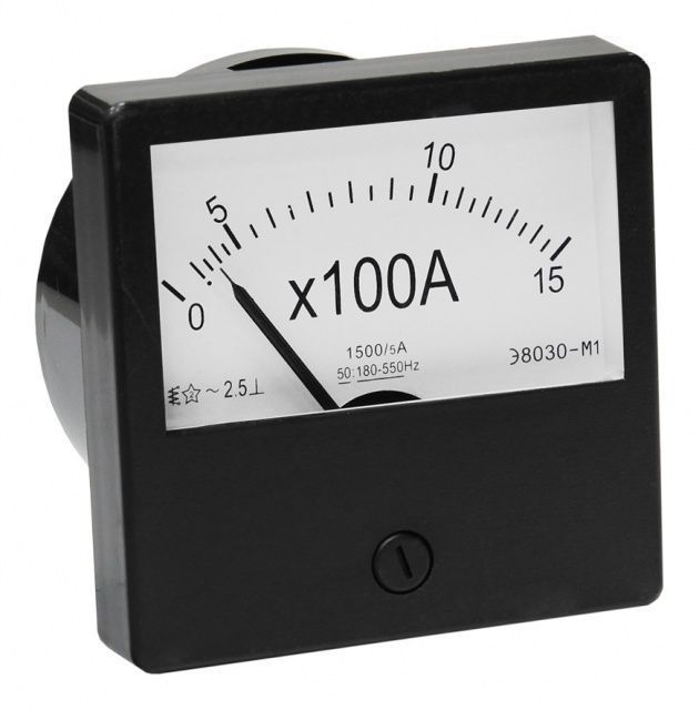 Амперметр – измерительный прибор для определения силы переменного тока в электрической цепи. Прибор включается последовательно в цепь нагрузки при непосредственном включении или через измерительные трансформаторы тока. Прибор предназначен для стационарной установки и является показывающим средством измерения. Каждый амперметр имеет обозначения, которые наносят на корпус, шкалу и у клемм. Обозначение измеряемой величины. Его указывают обычно на шкале в виде единиц измерения, в которых градуирован прибор. Например, A (амперы) или V (вольты) и т.д. По наименованию единицы измеряемой величины дается наименование прибора. Класс точности указывается в виде числа, которое наносится на шкалу прибора – 2,5. Род и частота тока. Приборы для измерения переменного тока в цепях на шкале имеют следующее обозначение: ~ Приборы работают в следующем диапазоне частот и имеют обозначения: 50Hz, 180-550Hz. Рабочее положение прибора обозначается следующими символами: ┴ - вертикальное. Испытательное напряжение изоляции – 2кВ. Измерительный механизм прибора имеет электромагнитную систему. Амперметры серии Э-8030 являются наиболее востребованными на отечественном рынке, и, несмотря на низкую цену, превосходят по всем параметрам аналоги, появившиеся в последние годы. Технические решения, реализованные в приборах Э-8030, были разработаны во времена СССР и за прошедшие годы подверглись значительным усовершенствованиям. Прибор Э-8030 - это надежное средство измерения, гарантирующее долговременную и безупречную работу на самых ответственных объектах народного хозяйства. Согласно Федеральному закону от 26.06.2008 N 102-ФЗ «Об обеспечении единства измерений», амперметр Э8030-М1 производства ТЕХЭНЕРГО занесен в единый реестр средств измерений и имеет регистрационный номер 69051-17.