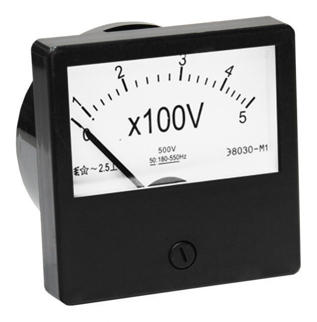 Вольтметр – измерительный прибор непосредственного отсчета для определения напряжения в электрических цепях. Прибор включается параллельно в цепь нагрузки или через измерительный трансформатор напряжения. Прибор предназначен для стационарной установки и является показывающим средством измерения. Каждый вольтметр имеет обозначения, которые наносят на корпус, шкалу и у клемм. Обозначение измеряемой величины. Его указывают на шкале в виде единиц измерения, в которых градуирован прибор. Например, V (вольт). По наименованию единицы измеряемой величины дается наименование прибора. Класс точности указывается в виде числа, которое наносится на шкалу прибора- 2.5 Приборы для измерения переменного напряжения в цепях на шкале имеют обозначение: ~. Приборы работают в следующем диапазоне частот и имеют обозначения: 50Hz, 180-550Hz. Рабочее положение прибора: ┴ - вертикальное. Испытательное напряжение изоляции – 2кВ. Измерительный механизм прибора имеет электромагнитную систему. Вольтметры серии Э-8030 являются наиболее востребованными на отечественном рынке, и, несмотря на низкую цену, превосходят по всем параметрам аналоги, появившиеся в последние годы. Технические решения, ре ализованные в приборах Э-8030, были разработаны во в ремена СССР и за прошедшие годы подверглись значительным усовершенствованиям. Прибор Э-8030 - это надежное средство измерения, гарантирующее долговременную и безупречную работу на самых ответственных объектах народного хозяйства Согласно Федеральному закону от 26.06.2008 N 102-ФЗ «Об обеспечении единства измерений», вольтметр Э8030-М1 производства ТЕХЭНЕРГО занесен в единый реестр средств измерений и имеет РЕГИСТРАЦИОННЫЙ № 69051-17.