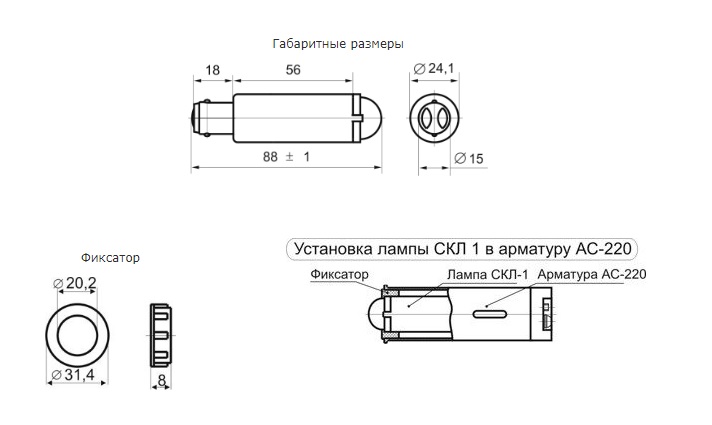 Светодиодная коммутаторная лампа СКЛ 1 Светодиодные коммутаторные лампы СКЛ 1 с цоколем B15d применяются для световой индикации и сигнализации в электрооборудовании различного назначения (на приборных панелях, в электрощитах, пультах, радиоэлектронной аппаратуре, бытовой технике). Лампы СКЛ 1 устанавливаются в арматуру АС-220 (с фиксатором) вместо ламп накаливания с цилиндрической колбой. Преимущества ламп СКЛ перед лампами накаливания: • гарантийная наработка на отказ более 25 000 часов, • безотказная работа при температуре окружающей среды от –60º до +60 ºС, • высокая экономичность за счет малого тока потребления - от 3 до 20 мА (потребляемая мощность 2 Вт), • устойчивы к вибрации, ударам и прочим механическим воздействиям, • степень защиты IP-54 по ГОСТ 14254-96, по требованию заказчика изготавливаются лампы со степенью защиты IP-66, • выпускаются на напряжения 6, 12, 24, 28, 36, 48, 55, 60, 75, 110, 127, 220, 380В. Светодиодные коммутаторные лампы СКЛ являются заменой светосигнальной арматуры АЕ, АМЕ, АВР, АС-220, АС-1201 и др. (установочный диаметр - 8 мм, 14 мм, 22 мм и 27 мм), а также заменой ламп накаливания со стандартными цоколями (Е27, Е14, Е10, B22d, B15d, B15s, B9s). Взаимозаменяемы со всеми распространенными типами светосигнальной арматуры различных производителей - ABB, Schneider Electric, EAO, ИЭК и других.