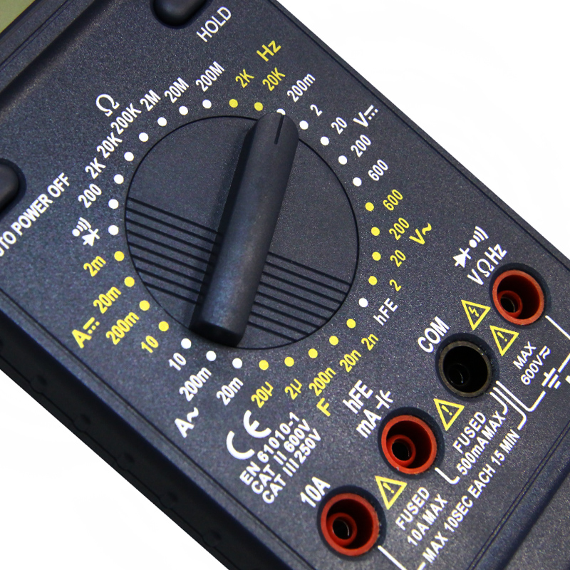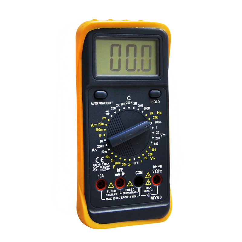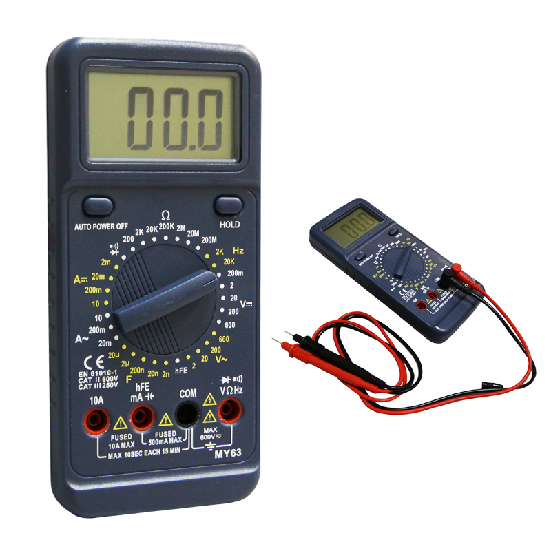 Цифровой мультиметр MY63 измеряет величины силу постоянного и переменного тока, постоянного и переменного напряжения. сопротивления, коэффициента усиления биполярных транзисторов, емкость конденсаторов и частоту синусоидального сигнала в звуковом диапазоне. Высокое входное сопротивление не вносит погрешности при измерениях величин и говорит о высокой точности прибора. В приборе применен АЦП с измерением значений методом двойного интегрирования. Выбор пределов измерения величин производится вручную путем установки нужного положения многопозиционного переключателя. С помощью мультиметра MY63 можно проверять полупроводниковые диоды и прозванивать электрические цепи. Результаты измерений выводятся на крупный цифровой 3¾ -разрядный ЖК-дисплей. Питание осуществляется от одной батареи 9В типа "Крона". Мультиметр имеет кнопку "AUTO POWER OFF" и кнопку памяти "HOLD". Защитный кожух из мягкого полимера, входящий в комплект поставки мультиметра MY63, сохранит прибор от повреждения при падении или ударе. Рабочее положение измерительного прибора можно изменять с помощью откидного упора на тыльной стороне корпуса. На кожухе имеется специальное отверстие для крепления мультиметра в вертикальном полложении на стене, панели, а также пазы для фиксации щупов при неработающем мультиметре. Цифровой мультиметр MY61 принципиально отличается от модели MY61 возможностью измерять частоту синусоидального сигнала в диапазоне частот от 1 Гц до 20 кГц и от MY62 отсутствием возможности измерять температуру окружающей среды. Разрядность шкалы дисплея: 2000 отсчетов Постоянное напряжение: 0,1 мВ … 1000 В, базовая погрешность ±0,5% ±3 единицы счета Переменное напряжение: 0,1 мВ … 750 В, базовая погрешность ±0,8% ±3 единицы счета Постоянный ток: 1 мкА … 10 А, базовая погрешность ±1,5% ±1 единица счета Переменный ток: 1 мкА … 10 А, погрешность ±1,8% ±5 единиц счета Сопротивление: 0,1 Ом … 200 МОм, базовая погрешность ±0,8% ±2 единицы счета Емкость: 1 пФ ... 20 мкФ, базовая погрешность ±4% ±3 единицы счета Звуковая прозвонка: сигнал при сопротивлении менее ~50 Ом Тест диодов: 2,7 В Тест hFE транзисторов: 0 … 1000 Частота выборки: 3 Гц Входной импеданс: ~ 10 МОм Отображение пределов измерения в соответствии с выбранным режимом Автоотключение питания: 30 минут отсутствия активности Индикация перегрузки: символ «OL» на ЖК-дисплее Индикатор разряда батарей Диапазон рабочих температур: 0°С ... +40°С при отн. влажности менее 80% Диапазон температур хранения: -0°С ... +60°С при отн. влажности менее 70% Максимальное допустимое напряжение: CAT III – 1000 В, CAT IV – 600 В Класс безопасности: CE ETL CAT.II 1000V CAT.III 600V RoHS Предохранители: 250 мА/250В и 10 А/500 В ПРЕДЕЛЫ ИЗМЕРЕНИЙ Постоянное напряжение: 200мВ / 2В / 20В / 200В / 600В Переменное напряжение: 2В / 20В / 200В / 600В Постоянный ток: 2мА / 20мА / 200мА / 10А Переменный ток: 20мА / 200мА / 10А Сопротивление: 200Ω / 2кΩ / 20кΩ / 200кΩ / 2МΩ / 20МΩ / 200 МΩ Емкость конденсаторов: 2нФ / 20нФ / 200нФ / 2мкФ / 20мкФ Частота f: 2кГц / 20кГц Прозвонка соединений - сигнал подается при сопротивлении 60 Ом Диодный тест - да Измерение hFE транзисторов – да Питание: батарея 1 шт. х 9 В тип 6F22 Комплект поставки: прибор, батарея, измерительные щупы, Multi -Function Socket (разъем для транзисторов), , паспорт Размеры: 188 х 93 х 50 мм Масса: 395 г Масса с упаковкой: 605 г