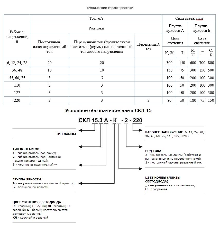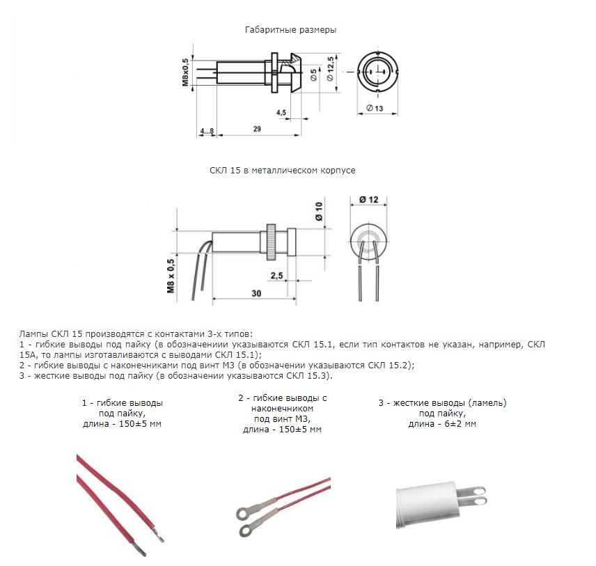 Светосигнальная арматура СКЛ 15 Светодиодные индикаторные лампы СКЛ 15 предназначены для установки на панелях электрощитов, пультов и прочего электрооборудования. Крепление к панели производится при помощи гайки. Установочный диаметр арматуры СКЛ 15 - 8 мм. Лампы СКЛ 15 производятся с контактами 3-х типов: 1 - гибкие выводы под пайку (в обозначениии указываются СКЛ 15.1, если тип контактов не указан, например, СКЛ 15А, то лампы изготавливаются с выводами СКЛ 15.1), 2 - гибкие выводы с наконечниками под винт М3 (в обозначении указываются СКЛ 15.2), 3 - жесткие выводы под пайку (в обозначении указываются СКЛ 15.3). Преимущества ламп СКЛ: • гарантийная наработка на отказ более 25 000 часов, • безотказная работа при температуре окружающей среды от –60o до +60 oС, • высокая экономичность за счет малого тока потребления - от 3 до 20 мА (потребляемая мощность 2 Вт), • устойчивы к вибрации, ударам и прочим механическим воздействиям, • степень защиты IP-54 по ГОСТ 14254-96, по требованию заказчика изготавливаются лампы со степенью защиты IP-66, • выпускаются на напряжения 6, 12, 24, 28, 36, 48, 55, 60, 75, 110, 127, 220, 380В.