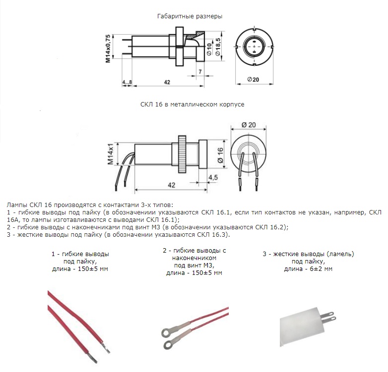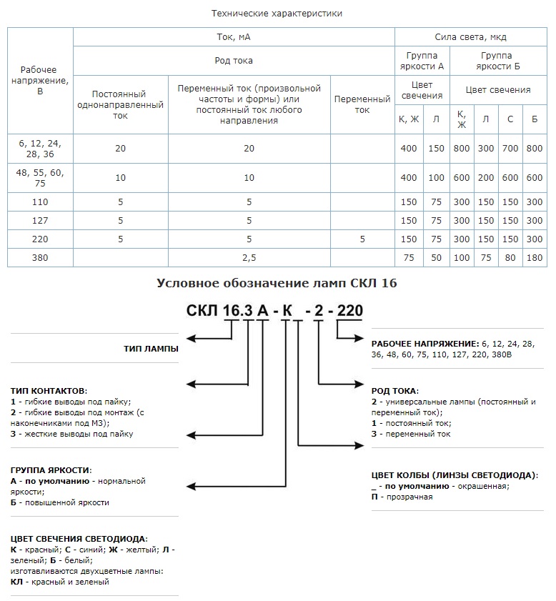 Светосигнальная арматура СКЛ 16 Светодиодные индикаторные лампы СКЛ 16 предназначены для установки на панелях электрощитов, пультов и прочего электрооборудования. Крепление к панели производится при помощи гайки. Являются заменой светосигнальной арматуры типа АС-1201, АВР (с установочным диаметром 16 мм). Лампы СКЛ 16 производятся с контактами 3-х типов: 1 - гибкие выводы под пайку (в обозначении указываются СКЛ 16.1, если тип контактов не указан, например, СКЛ 16А, то лампы изготавливаются с выводами СКЛ 16.1), 2 - гибкие выводы с наконечниками под винт М3 (в обозначении указываются СКЛ 16.2), 3 - жесткие выводы под пайку (в обозначении указываются СКЛ 16.3). Преимущества ламп СКЛ: • гарантийная наработка на отказ более 25 000 часов, • безотказная работа при температуре окружающей среды от –60o до +60 oС, • высокая экономичность за счет малого тока потребления - от 3 до 20 мА (потребляемая мощность 2 Вт), • устойчивы к вибрации, ударам и прочим механическим воздействиям, • степень защиты IP-54 по ГОСТ 14254-96, по требованию заказчика изготавливаются лампы со степенью защиты IP-66, • выпускаются на напряжения 6, 12, 24, 28, 36, 48, 55, 60, 75, 110, 127, 220, 380В.80В.