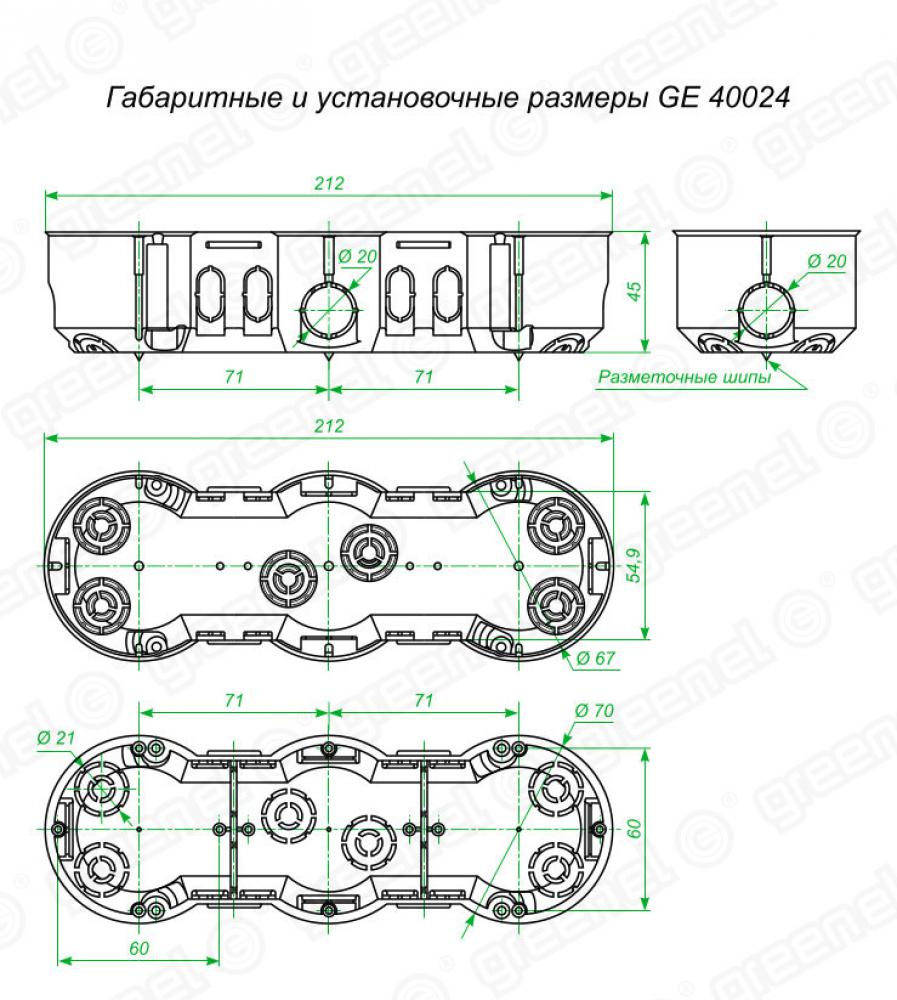 Для монтажа бытовых розеток, выключателей, светорегуляторов и иных приборов на винтах или металлических захватах в полые (гипсокартон, стеновые панели) стены, при скрытой электропроводке блоком из трех приборов, объединенных тройной декоративной рамкой. Присоединительные размеры 180 (60+60+60)мм, глубина 45мм. Размер: 212х70х45мм Защита: IP30 Цвет: Зеленый