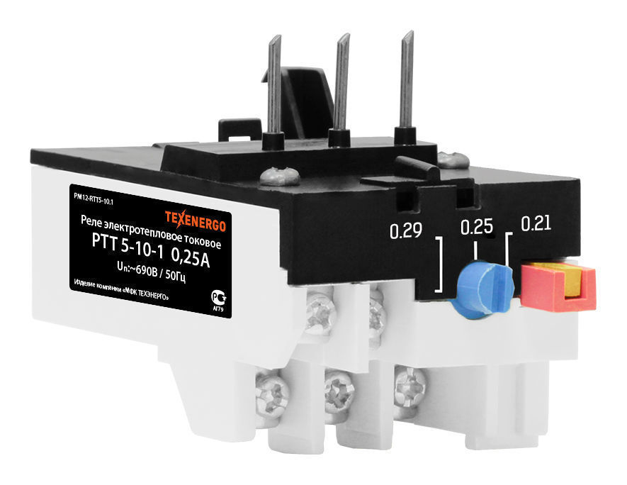 Реле электротепловые токовые типа РТТ5-10 предназначены для защиты трехфазных асинхронных электродвигателей с короткозамкнутым ротором от токовых перегрузок недопустимой продолжительности, в том числе возникающих при выпадении одной из фаз. Номинальное напряжение главной и вспомогательной цепи: переменного тока - 660 В, постоянного тока - 440 В, частота сети переменного тока - 50, 60 Гц, номинальный ток вспомогательной цепи - 6,3 А. Реле имеет один размыкающий либо переключающий контакт. Размыкающие контакты выполнены со свободным расцеплением.