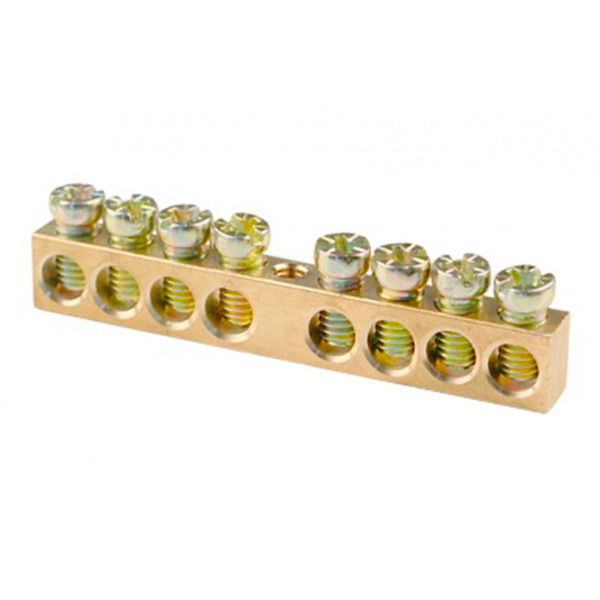 Применяются в щитовом оборудовании для подсоединения нулевых рабочих (N) и нулевых защитных проводов (PE). Крепление шины предусмотрено по центру (типы 8/1,14/1) и по краям (типы 8/2,14/2) через изолятор нулевой шины на 35 мм монтажную DIN-рейку и через угловые изоляторы нулевой шины, а так же непосредственно на панель щита. Материал шины: латунь