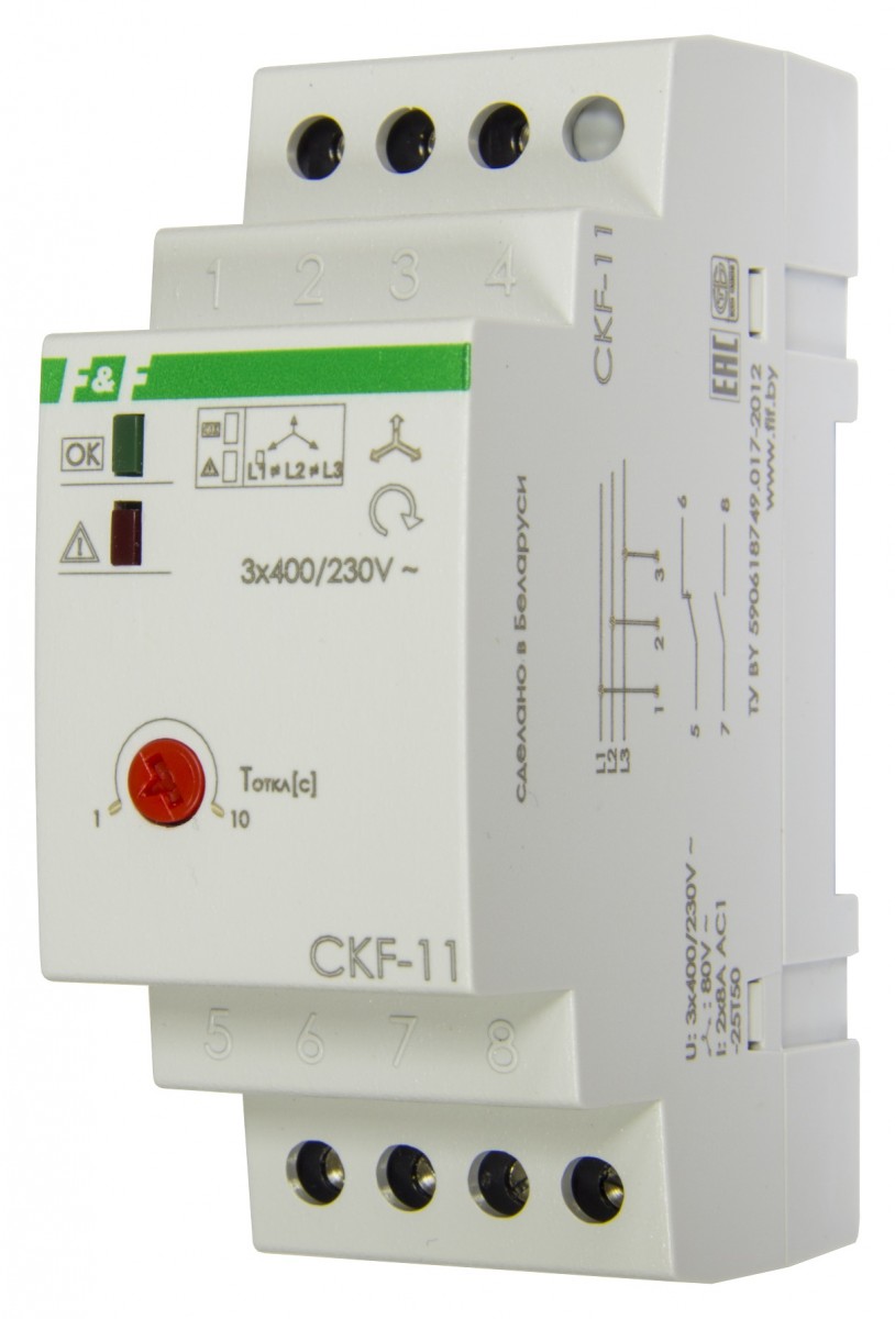 Автомат защиты электродвигателей CKF-11 предназначен для защиты электродвигателей и электроустановок, питаемых от трехфазной сети в случаях: отсутствия хотя бы одной из фаз, асимметрии напряжения, нарушения чередования фаз, контроль верхнего значения напряжения, контроль нижнего значения напряжения. Принцип работы Если напряжение в пределах нормы, контакты исполнительного реле замкнуты и на контактор управления электродвигателем подается напряжение, управляющее его включением. В случае одной из вышеперечисленных аварийных ситуаций контакты реле размыкаются и контактор отключается. Выключение в случае асимметрии напряжения происходит с задержкой 1-10 с. В случаях отсутствия хотя бы одной из фаз либо нарушения чередования фаз изделие выключается с задержкой 0,1 с, а в случаях превышения верхнего значения напряжения - 0,5 с, снижения напряжения - 5 с. Включение происходит автоматически после восстановления сетевого напряжения питания. CKF-11 защищает также от симметричного падения напряжения в фазах. Изделие работает без нулевого провода.