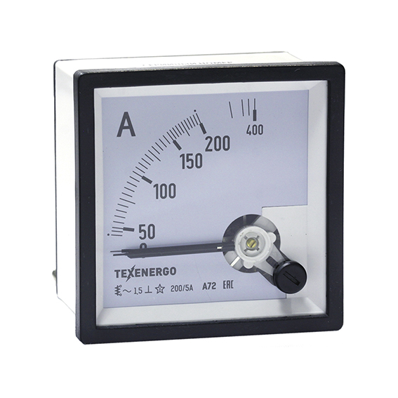 Амперметр типа А72 – электроизмерительный аналоговый прибор непосредственного отсчета для определения силы тока в электрических цепях. Прибор включается последовательно в цепь нагрузки или через измерительный трансформатор тока. Прибор предназначен для стационарной установки и является показывающим средством измерения. Каждый амперметр имеет обозначения, которые наносят на корпус, шкалу и у клемм. Амперметры являются приборами электромагнитной системы с подвижной частью на кернах и подпятниках. Принцип действия приборов электромагнитной системы основан на взаимодействии магнитного поля измеряемого тока (тока, проходящего через неподвижную катушку) с подвижным сердечником из ферромагнитного материала. Приборы имеют отcчетное устройство в виде равномерной или неравномерной квадрантной шкалы (движение стрелки по ходу часов с углом отклонения 90 градусов) с нулевой отметки на краю диапазона измерений и стрелочного указателя ножевого типа. Корректор нуля механический. Конструктивно приборы выполнены в диэлектрических пластиковых корпусах, защищающих измерительный механизм от повреждений и загрязнений. Обозначение измеряемой величины. Его указывают на шкале в виде единиц измерения, в которых градуирован прибор. Например, А (ампер). По наименованию единицы измеряемой величины дается наименование прибора. Класс точности указывается в виде числа, которое наносится на шкалу прибора- 1.5 Приборы для измерения переменного тока в цепях на шкале имеют обозначение: ∼. Приборы работают в диапазоне нормальных частот от 45Hz до 65Hz. Рабочее положение прибора: ┴ - вертикальное. Испытательное напряжение изоляции – 2кВ. Согласно Федеральному закону от 26.06.2008 N 102-ФЗ «Об обеспечении единства измерений», амперметр А72 производства ТЕХЭНЕРГО занесен в единый реестр средств измерений и имеет регистрационный номер 69051-17.