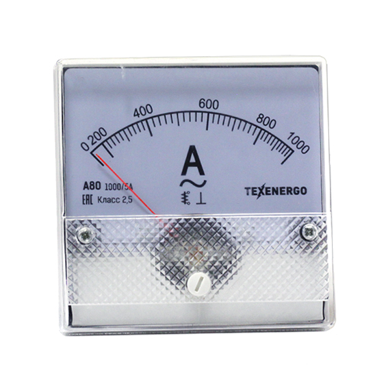 Амперметр типа А80 – электроизмерительный аналоговый прибор непосредственного отсчета для определения силы тока в электрических цепях. Прибор включается последовательно в цепь нагрузки или через измерительный трансформатор тока. Прибор предназначен для стационарной установки и является показывающим средством измерения. Каждый амперметр имеет обозначения, которые наносят на корпус, шкалу и у клемм. Амперметры являются приборами электромагнитной системы с подвижной частью на кернах и подпятниках. Принцип действия приборов электромагнитной системы основан на взаимодействии магнитного поля измеряемого тока (тока, проходящего через неподвижную катушку) с подвижным сердечником из ферромагнитного материала. Приборы имеют отсчетное устройство в виде равномерной или неравномерной квадрантной шкалы (движение стрелки по ходу часов с углом отклонения 90 градусов) с нулевой отметки на краю диапазона измерений и стрелочного указателя ножевого типа. Корректор нуля механический. Конструктивно приборы выполнены в диэлектрических пластиковых корпусах, защищающих измерительный механизм от повреждений и загрязнений. Корпус прибора изготовлен из самозатухающего пластика, обеспечивающего пожаро- и электробезопасность. Устанавливаются в круглый вырез щитка, изготовленных советскими штампами. А80 позиционируются как бюджетная серия амперметров, с более низким классом точности 2.5 и более низкую цену относительно приборов типа А72, А96, Э8030-М1. Обозначение измеряемой величины. Его указывают на шкале в виде единиц измерения, в которых градуирован прибор. Например, А (ампер). По наименованию единицы измеряемой величины дается наименование прибора. Класс точности указывается в виде числа, которое наносится на шкалу прибора - 2.5 Приборы для измерения переменного напряжения в цепях на шкале имеют обозначение: ∼. Приборы работают в диапазоне нормальных частот от 45Hz до 65Hz. Рабочее положение прибора: ┴ - вертикальное. Испытательное напряжение изоляции – 2кВ.