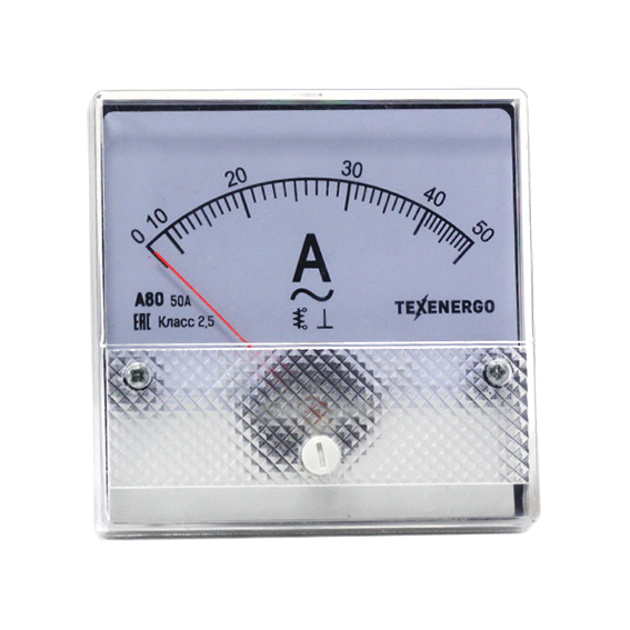 Амперметр типа А80 – электроизмерительный аналоговый прибор непосредственного отсчета для определения силы тока в электрических цепях. Прибор включается последовательно в цепь нагрузки или через измерительный трансформатор тока. Прибор предназначен для стационарной установки и является показывающим средством измерения. Каждый амперметр имеет обозначения, которые наносят на корпус, шкалу и у клемм. Амперметры являются приборами электромагнитной системы с подвижной частью на кернах и подпятниках. Принцип действия приборов электромагнитной системы основан на взаимодействии магнитного поля измеряемого тока (тока, проходящего через неподвижную катушку) с подвижным сердечником из ферромагнитного материала. Приборы имеют отсчетное устройство в виде равномерной или неравномерной квадрантной шкалы (движение стрелки по ходу часов с углом отклонения 90 градусов) с нулевой отметки на краю диапазона измерений и стрелочного указателя ножевого типа. Корректор нуля механический. Конструктивно приборы выполнены в диэлектрических пластиковых корпусах, защищающих измерительный механизм от повреждений и загрязнений. Корпус прибора изготовлен из самозатухающего пластика, обеспечивающего пожаро- и электробезопасность. Устанавливаются в круглый вырез щитка, изготовленных советскими штампами. А80 позиционируются как бюджетная серия амперметров, с более низким классом точности 2.5 и более низкую цену относительно приборов типа А72, А96, Э8030-М1. Обозначение измеряемой величины. Его указывают на шкале в виде единиц измерения, в которых градуирован прибор. Например, А (ампер). По наименованию единицы измеряемой величины дается наименование прибора. Класс точности указывается в виде числа, которое наносится на шкалу прибора - 2.5 Приборы для измерения переменного напряжения в цепях на шкале имеют обозначение: ∼. Приборы работают в диапазоне нормальных частот от 45Hz до 65Hz. Рабочее положение прибора: ┴ - вертикальное. Испытательное напряжение изоляции – 2кВ.
