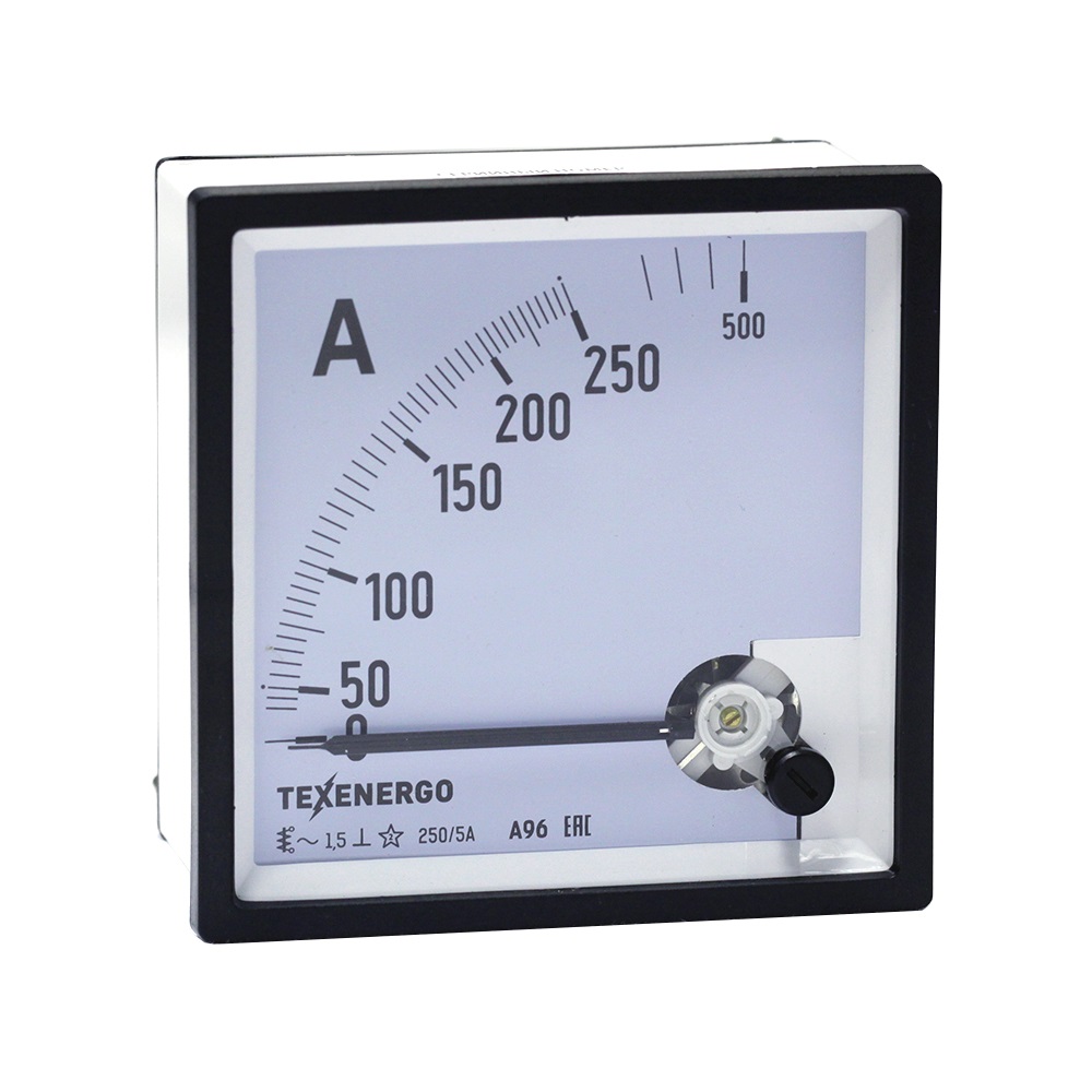 Амперметр типа А96 – электроизмерительный аналоговый прибор непосредственного отсчета для определения силы тока в электрических цепях. Прибор включается последовательно в цепь нагрузки или через измерительный трансформатор тока. Прибор предназначен для стационарной установки и является показывающим средством измерения. Каждый амперметр имеет обозначения, которые наносят на корпус, шкалу и у клемм. Амперметры являются приборами электромагнитной системы с подвижной частью на кернах и подпятниках. Принцип действия приборов электромагнитной системы основан на взаимодействии магнитного поля измеряемого тока (тока, проходящего через неподвижную катушку) с подвижным сердечником из ферромагнитного материала. Приборы имеют отсчетное устройство в виде равномерной или неравномерной квадрантной шкалы (движение стрелки по ходу часов с углом отклонения 90 градусов) с нулевой отметки на краю диапазона измерений и стрелочного указателя ножевого типа. Корректор нуля механический. Конструктивно приборы выполнены в диэлектрических пластиковых корпусах, защищающих измерительный механизм от повреждений и загрязнений. Обозначение измеряемой величины. Его указывают на шкале в виде единиц измерения, в которых градуирован прибор. Например, А (ампер). По наименованию единицы измеряемой величины дается наименование прибора. Класс точности указывается в виде числа, которое наносится на шкалу прибора- 1.5 Приборы для измерения переменного тока в цепях на шкале имеют обозначение: ~. Приборы работают в диапазоне нормальных частот от 45Hz до 65Hz. Рабочее положение прибора: ┴ - вертикальное. Испытательное напряжение изоляции – 2кВ.