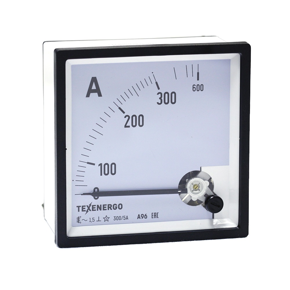 Амперметр типа А96 – электроизмерительный аналоговый прибор непосредственного отсчета для определения силы тока в электрических цепях. Прибор включается последовательно в цепь нагрузки или через измерительный трансформатор тока. Прибор предназначен для стационарной установки и является показывающим средством измерения. Каждый амперметр имеет обозначения, которые наносят на корпус, шкалу и у клемм. Амперметры являются приборами электромагнитной системы с подвижной частью на кернах и подпятниках. Принцип действия приборов электромагнитной системы основан на взаимодействии магнитного поля измеряемого тока (тока, проходящего через неподвижную катушку) с подвижным сердечником из ферромагнитного материала. Приборы имеют отсчетное устройство в виде равномерной или неравномерной квадрантной шкалы (движение стрелки по ходу часов с углом отклонения 90 градусов) с нулевой отметки на краю диапазона измерений и стрелочного указателя ножевого типа. Корректор нуля механический. Конструктивно приборы выполнены в диэлектрических пластиковых корпусах, защищающих измерительный механизм от повреждений и загрязнений. Обозначение измеряемой величины. Его указывают на шкале в виде единиц измерения, в которых градуирован прибор. Например, А (ампер). По наименованию единицы измеряемой величины дается наименование прибора. Класс точности указывается в виде числа, которое наносится на шкалу прибора- 1.5 Приборы для измерения переменного тока в цепях на шкале имеют обозначение: ~. Приборы работают в диапазоне нормальных частот от 45Hz до 65Hz. Рабочее положение прибора: ┴ - вертикальное. Испытательное напряжение изоляции – 2кВ.