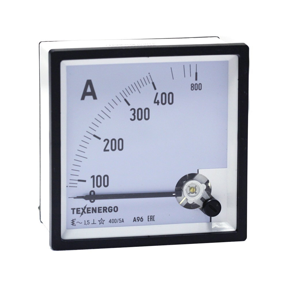 Амперметр типа А96 – электроизмерительный аналоговый прибор непосредственного отсчета для определения силы тока в электрических цепях. Прибор включается последовательно в цепь нагрузки или через измерительный трансформатор тока. Прибор предназначен для стационарной установки и является показывающим средством измерения. Каждый амперметр имеет обозначения, которые наносят на корпус, шкалу и у клемм. Амперметры являются приборами электромагнитной системы с подвижной частью на кернах и подпятниках. Принцип действия приборов электромагнитной системы основан на взаимодействии магнитного поля измеряемого тока (тока, проходящего через неподвижную катушку) с подвижным сердечником из ферромагнитного материала. Приборы имеют отсчетное устройство в виде равномерной или неравномерной квадрантной шкалы (движение стрелки по ходу часов с углом отклонения 90 градусов) с нулевой отметки на краю диапазона измерений и стрелочного указателя ножевого типа. Корректор нуля механический. Конструктивно приборы выполнены в диэлектрических пластиковых корпусах, защищающих измерительный механизм от повреждений и загрязнений. Обозначение измеряемой величины. Его указывают на шкале в виде единиц измерения, в которых градуирован прибор. Например, А (ампер). По наименованию единицы измеряемой величины дается наименование прибора. Класс точности указывается в виде числа, которое наносится на шкалу прибора- 1.5 Приборы для измерения переменного тока в цепях на шкале имеют обозначение: ~. Приборы работают в диапазоне нормальных частот от 45Hz до 65Hz. Рабочее положение прибора: ┴ - вертикальное. Испытательное напряжение изоляции – 2кВ.