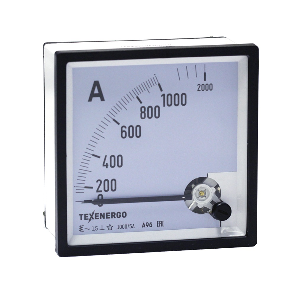 Амперметр типа А96 – электроизмерительный аналоговый прибор непосредственного отсчета для определения силы тока в электрических цепях. Прибор включается последовательно в цепь нагрузки или через измерительный трансформатор тока. Прибор предназначен для стационарной установки и является показывающим средством измерения. Каждый амперметр имеет обозначения, которые наносят на корпус, шкалу и у клемм. Амперметры являются приборами электромагнитной системы с подвижной частью на кернах и подпятниках. Принцип действия приборов электромагнитной системы основан на взаимодействии магнитного поля измеряемого тока (тока, проходящего через неподвижную катушку) с подвижным сердечником из ферромагнитного материала. Приборы имеют отсчетное устройство в виде равномерной или неравномерной квадрантной шкалы (движение стрелки по ходу часов с углом отклонения 90 градусов) с нулевой отметки на краю диапазона измерений и стрелочного указателя ножевого типа. Корректор нуля механический. Конструктивно приборы выполнены в диэлектрических пластиковых корпусах, защищающих измерительный механизм от повреждений и загрязнений. Обозначение измеряемой величины. Его указывают на шкале в виде единиц измерения, в которых градуирован прибор. Например, А (ампер). По наименованию единицы измеряемой величины дается наименование прибора. Класс точности указывается в виде числа, которое наносится на шкалу прибора- 1.5 Приборы для измерения переменного напряжения в цепях на шкале имеют обозначение: ~. Приборы работают в диапазоне нормальных частот от 45Hz до 65Hz. Рабочее положение прибора: ┴ - вертикальное. Испытательное напряжение изоляции – 2кВ.