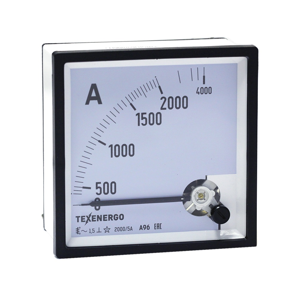 Амперметр типа А96 – электроизмерительный аналоговый прибор непосредственного отсчета для определения силы тока в электрических цепях. Прибор включается последовательно в цепь нагрузки или через измерительный трансформатор тока. Прибор предназначен для стационарной установки и является показывающим средством измерения. Каждый амперметр имеет обозначения, которые наносят на корпус, шкалу и у клемм. Амперметры являются приборами электромагнитной системы с подвижной частью на кернах и подпятниках. Принцип действия приборов электромагнитной системы основан на взаимодействии магнитного поля измеряемого тока (тока, проходящего через неподвижную катушку) с подвижным сердечником из ферромагнитного материала. Приборы имеют отсчетное устройство в виде равномерной или неравномерной квадрантной шкалы (движение стрелки по ходу часов с углом отклонения 90 градусов) с нулевой отметки на краю диапазона измерений и стрелочного указателя ножевого типа. Корректор нуля механический. Конструктивно приборы выполнены в диэлектрических пластиковых корпусах, защищающих измерительный механизм от повреждений и загрязнений. Обозначение измеряемой величины. Его указывают на шкале в виде единиц измерения, в которых градуирован прибор. Например, А (ампер). По наименованию единицы измеряемой величины дается наименование прибора. Класс точности указывается в виде числа, которое наносится на шкалу прибора- 1.5 Приборы для измерения переменного напряжения в цепях на шкале имеют обозначение: ~. Приборы работают в диапазоне нормальных частот от 45Hz до 65Hz. Рабочее положение прибора: ┴ - вертикальное. Испытательное напряжение изоляции – 2кВ.