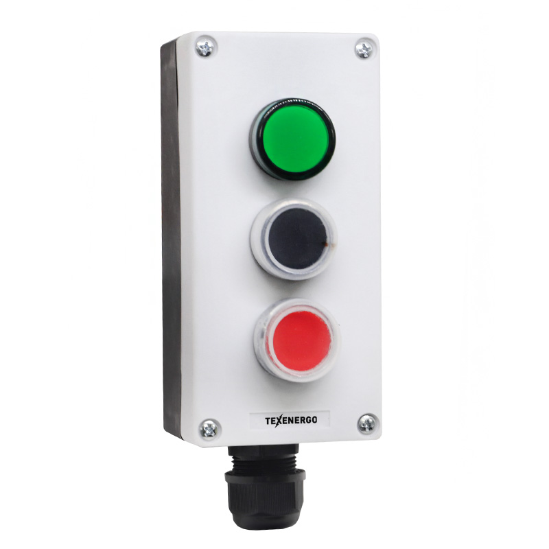 Корпус ПКУ 15-21 представляет собой пластиковый короб, состоящий из основания с отверстием под сальник типа PG и крышки с отверстиями от одного до шести элементов для установки кнопок управления типа ВК21, и светосигнальной арматуры типа AD22DS.