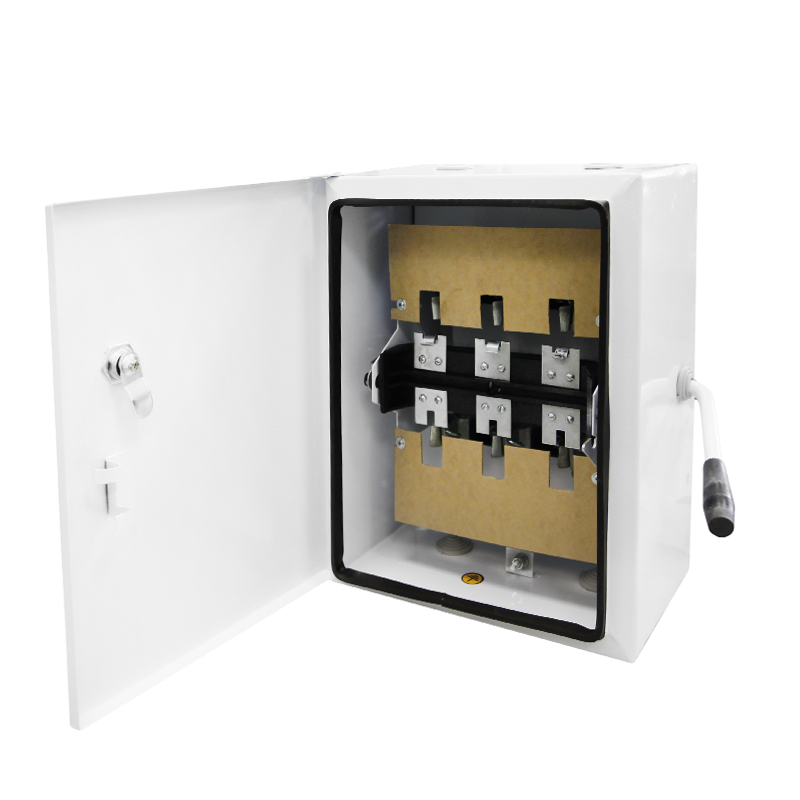 Ящик силовой с блоком "предохранитель - выключатель" унифицированный (ЯБПВУ-1 100А): Выключатель, у которого плавкая вставка или держатель с плавкой вставкой образуют подвижный контакт. НАЗНАЧЕНИЕ Ящик ЯБПВУ-1 предназначен для нечастых включений и отключений, а также для защиты электрических сетей и приемников от недопустимых длительных перегрузок и токов короткого замыкания. Ящики применяются в электрических установках как переменного, так и постоянного тока. КОНСТРУКЦИЯ Ящик представляет собой металлический корпус, в котором закреплен подвижный блок, на котором закреплены предохранители, выполняющие функцию подвижного контакта. Имеется возможность блокировки дверки. ТЕХНИЧЕСКИЕ ДАННЫЕ Номинальный ток предохранителей: 25, 50, 63, 80, 100 А
