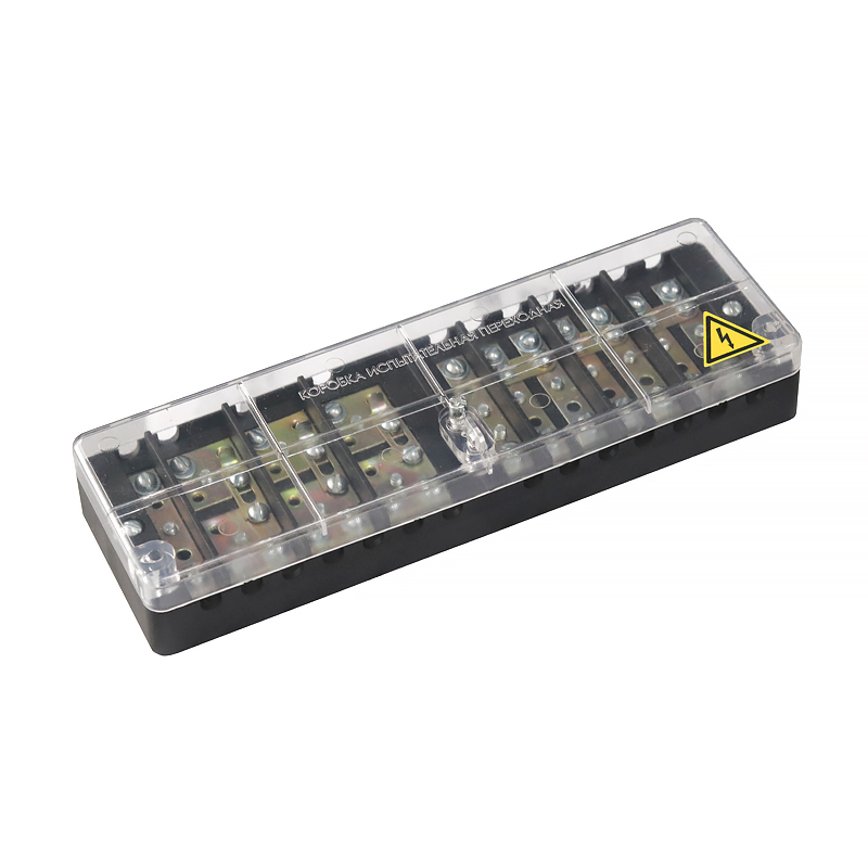 Коробки испытательные переходные применяются в пунктах установки средств учёта электроэнергии для обеспечения закорачивания вторичных цепей трансформаторов тока, отключения токовых цепей счетчика и цепей напряжения в каждой фазе счетчика при его проверке или замене без снятия напряжения в электроустановке. Коробки обеспечивают возможность включения образцового счетчика без отсоединения проводов и кабелей, а также защиту электрических соединений от несанкционированного доступа. Коробки предназначены для эксплуатации, хранения и транспортирования в макроклиматических районах с умеренным и холодным климатом, вид климатического исполнения – УХЛ, категория размещения 3 по ГОСТ 15150, при этом нижнее предельное значение температуры воздуха при эксплуатации, минус 60 °С, верхнее предельное значение температуры воздуха при эксплуатации, плюс 70 °С, при относительной влажности воздуха не более 98% при 25 °С, на высотах до 1000 м. Коробки не предназначены для эксплуатации в средах с повышенной взрывоопасностью, а также, в средах, содержащих кислоты, коррозионные газы или вещества. ТЕХНИЧЕСКИЕ ХАРАКТЕРИСТИКИ 1 Номинальное напряжение, В 380 В 2 Количество фаз 3 3 Номинальная частота, Гц 50 4 Номинальный ток, А 10 5 Класс защиты по ГОСТ 12.2.007.0 - II 6 Степень защиты от попадания внешних твердых предметов и вредного воздействия воды по ГОСТ 14254 - в закрытом состоянии IP 20 - со снятой крышкой нет защиты 7 Габариты, длина - ширина - высота, 220* 68* 33мм 8 Масса, кг 0,4 9 Материал корпуса стеклонаполненный огнеупорный полиамид 10 Сечение подключаемых проводников: 0,5 - 4мм2