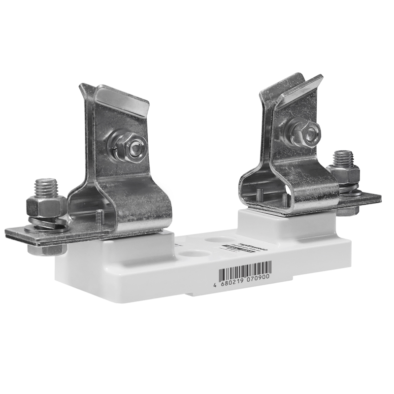Держатель низковольтного ножевого плавкого предохранителя Контакты предохранителя и держателя выполнены из электротехнической меди с гальваническим покрытием сплавом олово-висмут, что предотвращает их окисление в процессе эксплуатации. Основание держателя (изолятор) выполнено из армированной термореактивной пластмассы, стойкой к коррозии, механическим воздействиям, перепадам температуры и динамическим ударам, которые возникают при коротких замыканиях вплоть до 120 кА. Контакты плавкой вставки выполнены в форме ножа (заострены), что позволяет их устанавливать в держатели с меньшими усилиями.