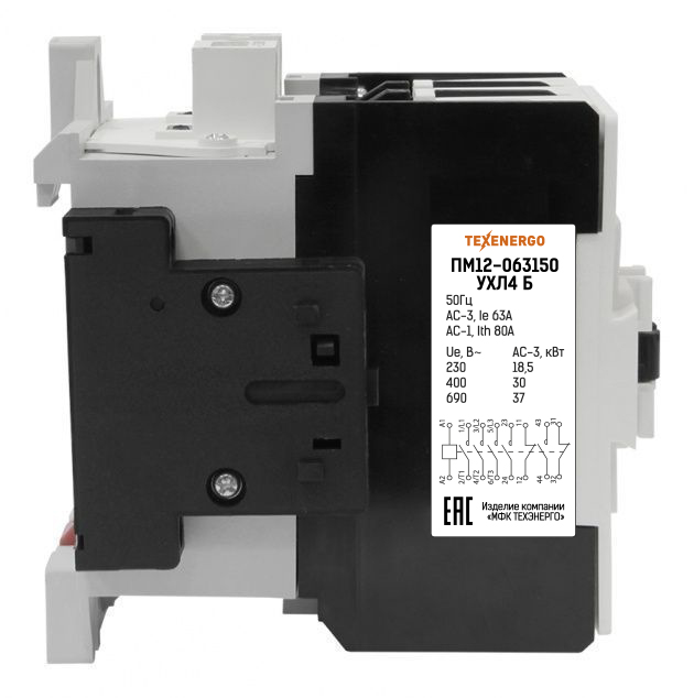Электромагнитные пускатели ПМ12 (магнитные пускатели ПМ12, контакторы ПМ12) предназначены для пуска и останова асинхронных двигателей с короткозамкнутым ротором. Применяются в конвейерах, станках, компрессорах, насосах, лифтах, эскалаторах, тепловых пушках, системах управления отоплением, вентиляцией и кондиционированием и т.д., а также для коммутации осветительных сетей. При наличии теплового реле, пускатель осуществляет защиту управляемого электродвигателя от перегрузок и от токов, возникающих при обрыве одной из фаз. Принцип действия: При подаче номинального напряжения на катушку она втягивает сердечник, и этим замыкает группу силовых и вспомогательных контактов. При достижении напряжения ниже порогового уровня на отпускание контакты размыкаются. Ассортимент аксессуаров для расширения функциональных возможностей пускателей ПМ12: Ссылки на аксессуары в нашем каталоге: Реле электротепловые серии РТТ, Приставки выдержки времени серии ПВЛ, Приставки контактные серии ПКЛ, Структура условного обозначения пускателей: 1. Обозначение серии 2. Цифры, указывающие условное обозначение номинального тока: 010 —10А, 025 —25А, 040 —40А, 063 —63А, 3. Цифра, указывающая условное обозначение пускателей по назначению и наличию теплового реле: 1 - нереверсивный пускатель без теплового реле, 2 - нереверсивный пускатель с тепловым реле, 5 - реверсивный пускатель без теплового реле, с мех. блокировкой и степенью защиты IP00, 6 - реверсивный пускатель с тепловым реле, с электрической и механической блокировками, 4. Цифра, указывающая исполнение пускателей по степени защиты и наличию кнопок управления: 0 - степень защиты IP00 1 - степень защиты IP54 без кнопок 2 - степень защиты IP54 с кнопками «Пуск» + «Стоп» 3 - степень защиты IP54 с кнопками «Пуск» + «Стоп» + сигнальная лампа 4 - степень защиты IP40 без кнопок 5 - степень защиты IP20 6 - степень защиты IP40 с кнопками «Пуск» + «Стоп» 7 - степень защиты IP40 «Пуск» + «Стоп» + сигнальная лампа 5. Цифра, указывающая исполнение пускателей по роду тока цепи управления: 0 - переменный 6. Буква, характеризующая климатическое исполнение по ГОСТ 15150: (У) - стандартное исполнение (Т) - тропическое Скачать структуру условного обозначения пускателей ПМ12 в формате .PDF