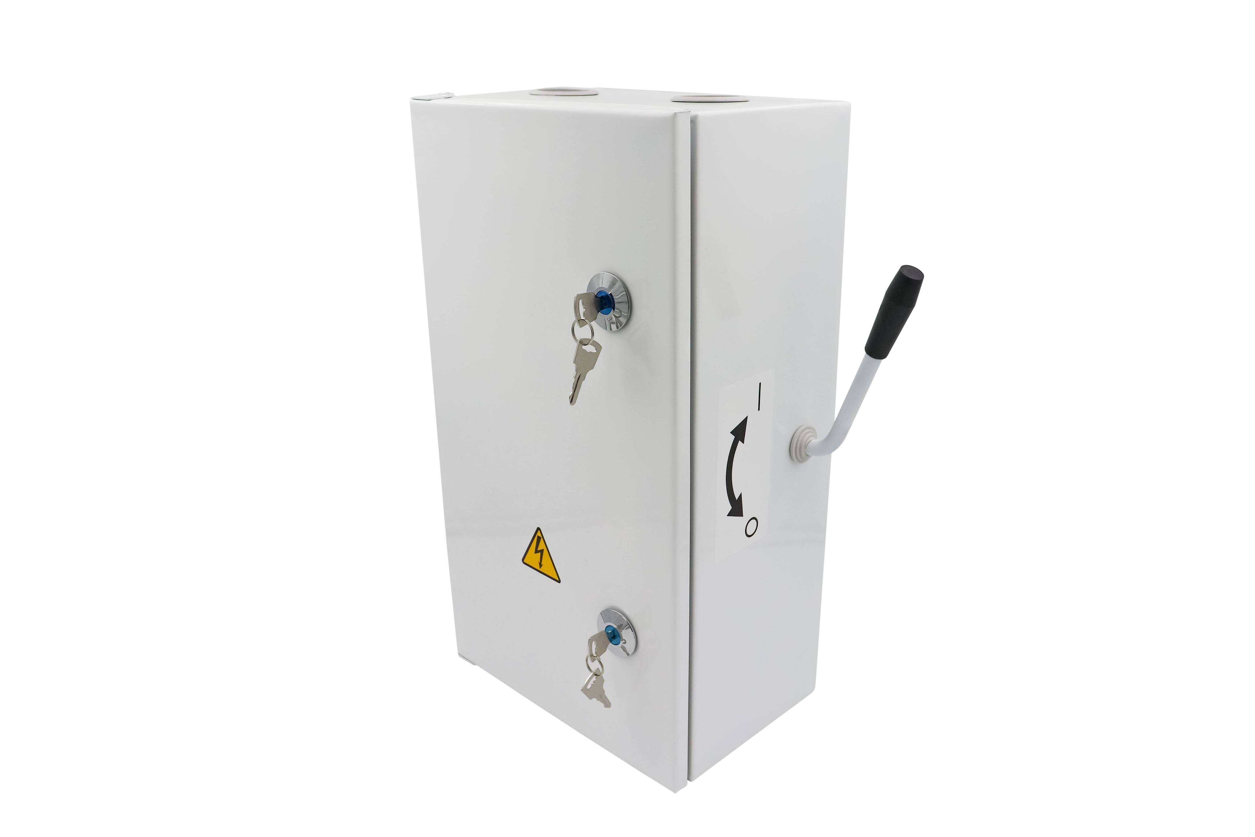 Ящик силовой с блоком "предохранитель - выключатель" унифицированный (ЯБПВУ-1 100А) (fuse-switch): Выключатель, у которого плавкая вставка или держатель с плавкой вставкой образуют подвижный контакт.НАЗНАЧЕНИЕ Ящик ЯБПВУ-1 предназначен для нечастых включений и отключений, а также для защиты электрических сетей и приемников от недопустимых длительных перегрузок и токов короткого замыкания. Ящики применяются в электрических установках как переменного, так и постоянного тока.КОНСТРУКЦИЯЯщик представляет собой металлический корпус с выпуклой дверцей, в котором закреплен подвижный блок, на котором закреплены предохранители, выполняющие функцию подвижного контакта. Имеется возможность блокировки дверки.ТЕХНИЧЕСКИЕ ДАННЫЕ Номинальный ток предохранителей: 25, 50, 63, 80, 100А